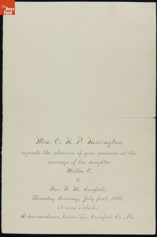 Wedding Invitation of Mollie C. Herrington and Rev. W. M. Canfield, Crawford County, Pennsylvania, July 1, 1886