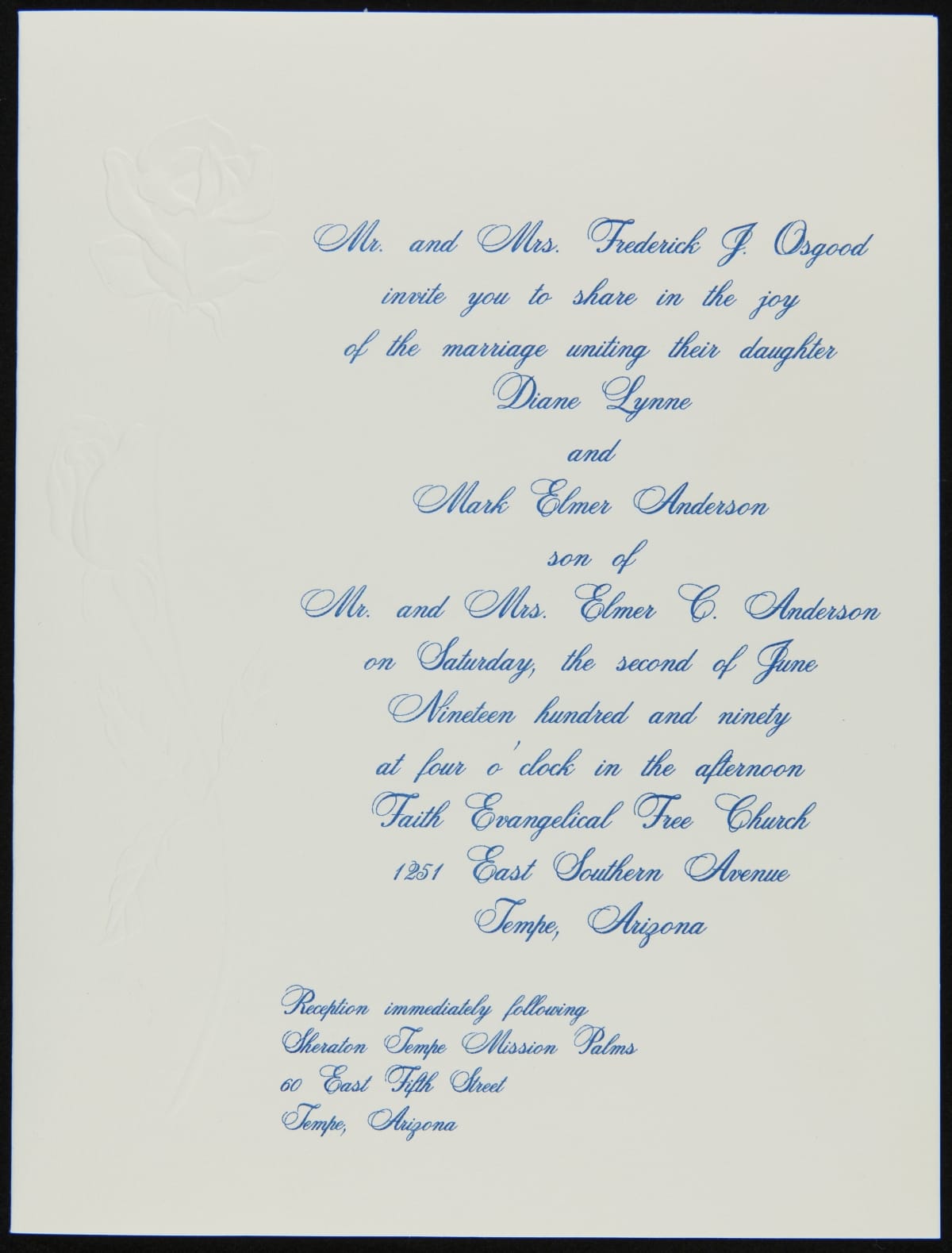 Wedding Invitation of Diane Lynne Osgood and Mark Elmer Anderson, Tempe, Arizona, June 2, 1990