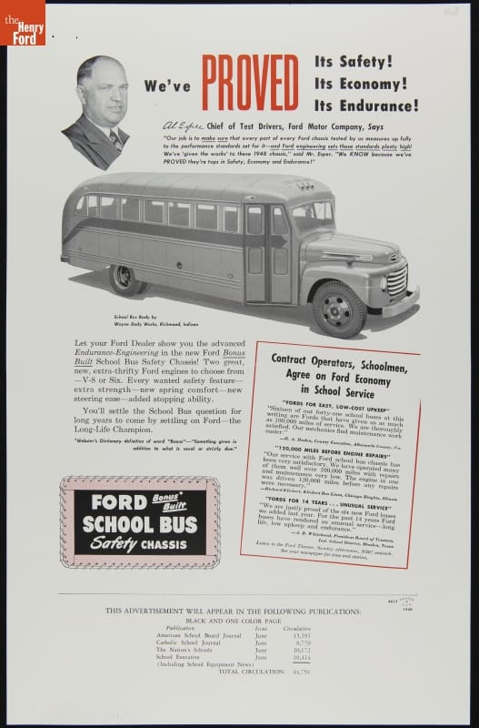 Ford emphasized the safety, economy, and reliability of its school bus chassis in this 1948 advertisement published in several professional education journals. The "Bonus Built" slogan was used with all of Ford's trucks and buses that model year -- suggesting that the all-new designs gave customers more than their money's worth.