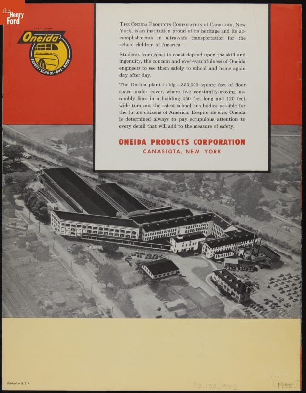 Established in Canastota, New York, in 1946, Oneida Products Corporation built school bus bodies at a time when the post-World War II baby boom made it a lucrative business. Oneida's school bus operations were sold to Marmon-Harrington Company in 1960 and subsequently moved to Indianapolis, Indiana.