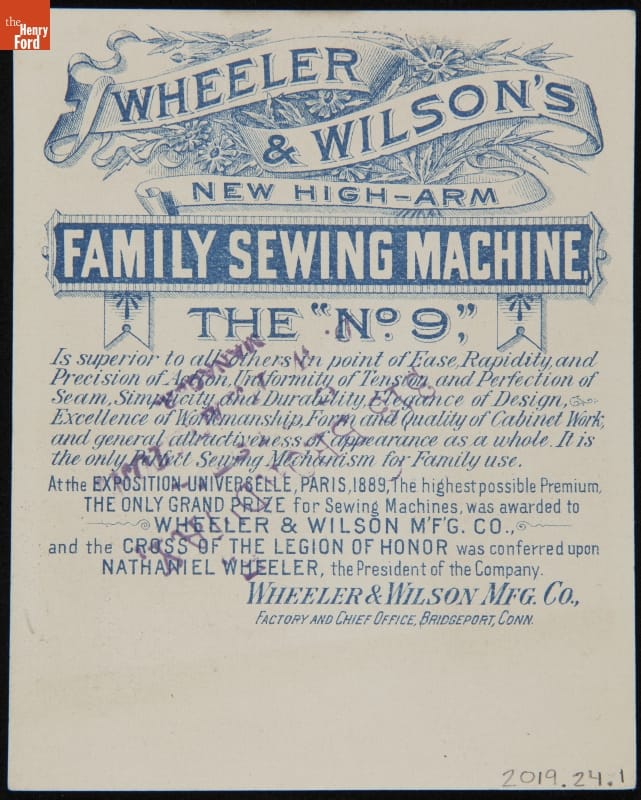 Trade Card for Wheeler & Wilson's New High-Arm Family Sewing Machine, the "No. 9," circa 1890