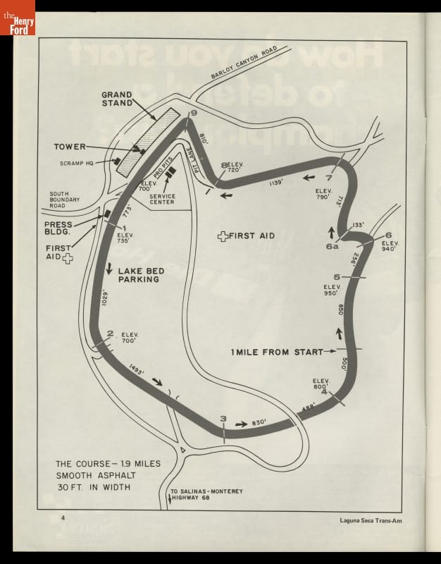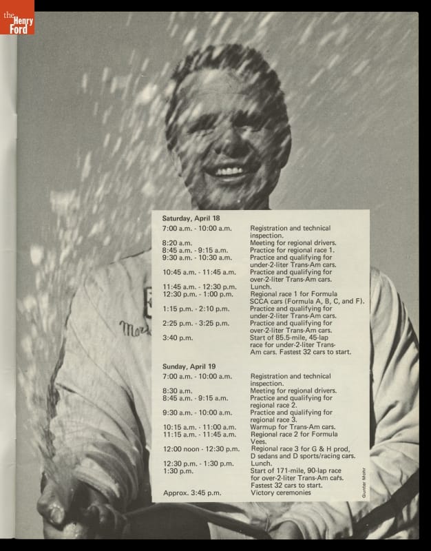 Dave Friedman captured and preserved auto racing history through his photography and memorabilia. His collection of event programs documents key races, cars, drivers, and teams. This program is from a Trans-Am race at Laguna Seca near Monterey, California, in April 1970. Parnelli Jones earned the victory in the #15 Ford Mustang Boss 302.