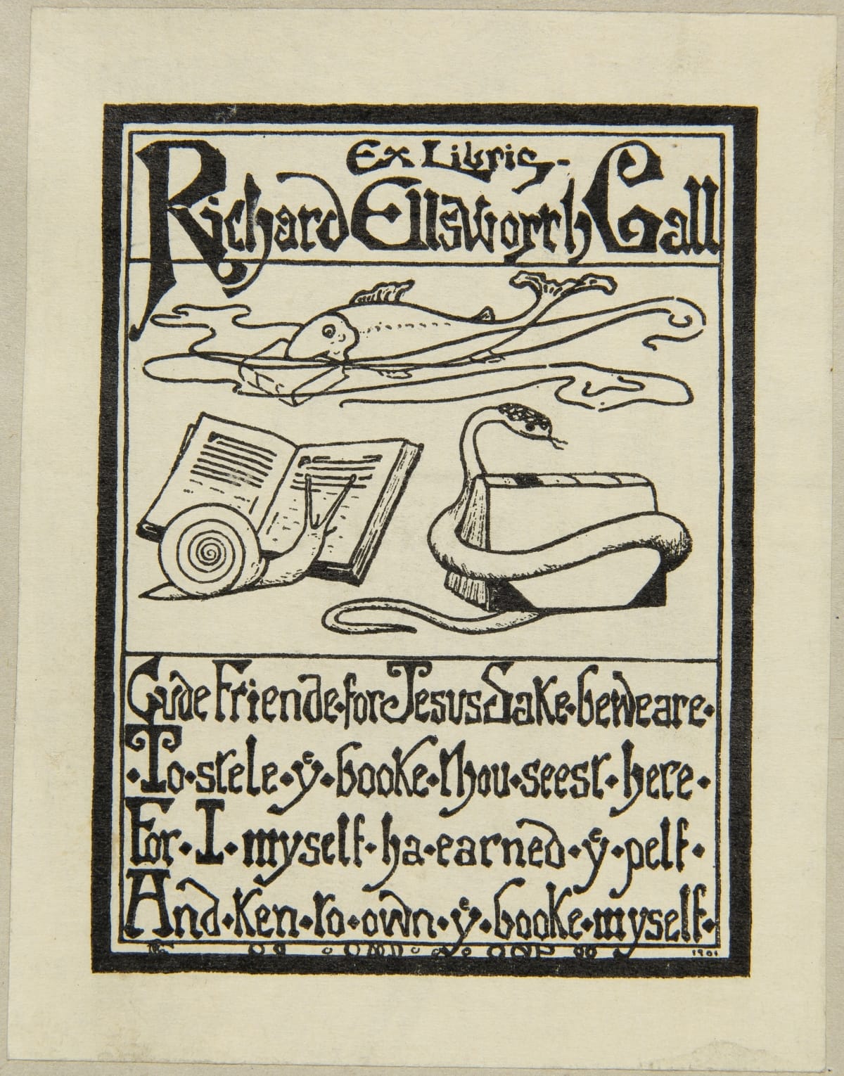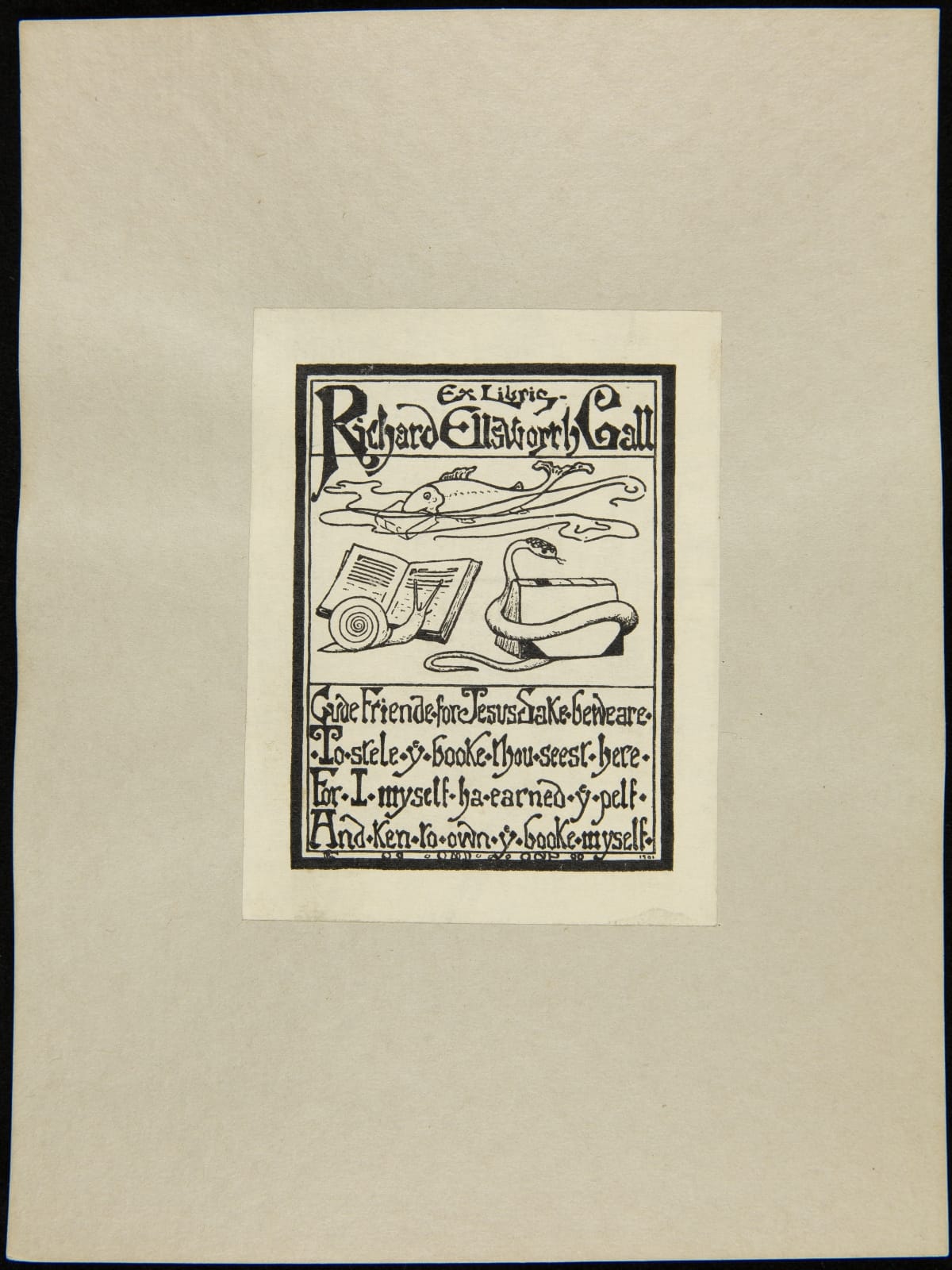 Ex Libris / Richard Ellsworth Call / Gude Friende for Jesus Sake beweare / To stele y booke you seest here / For I myself ha earned y pelf / And ken to own y booke myself / 1904