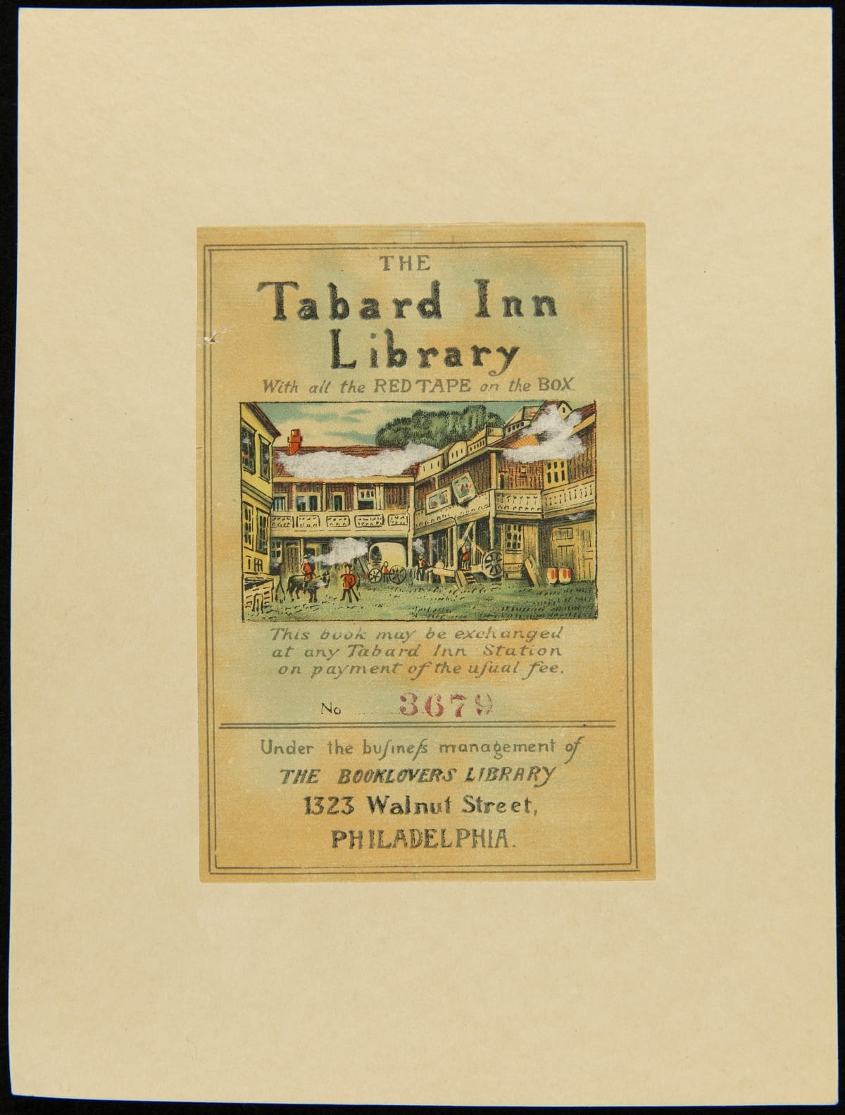 on front: THE Tabard Inn Library / With all the RED TAPE on the BOX / This book may be exchanged at any Tabard Inn Station on payment of the usual fee. / No. 3671 / Under the business management of THE BOOKLOVERS LIBRARY / 1323 Walnut Street, PHILADELPHIA