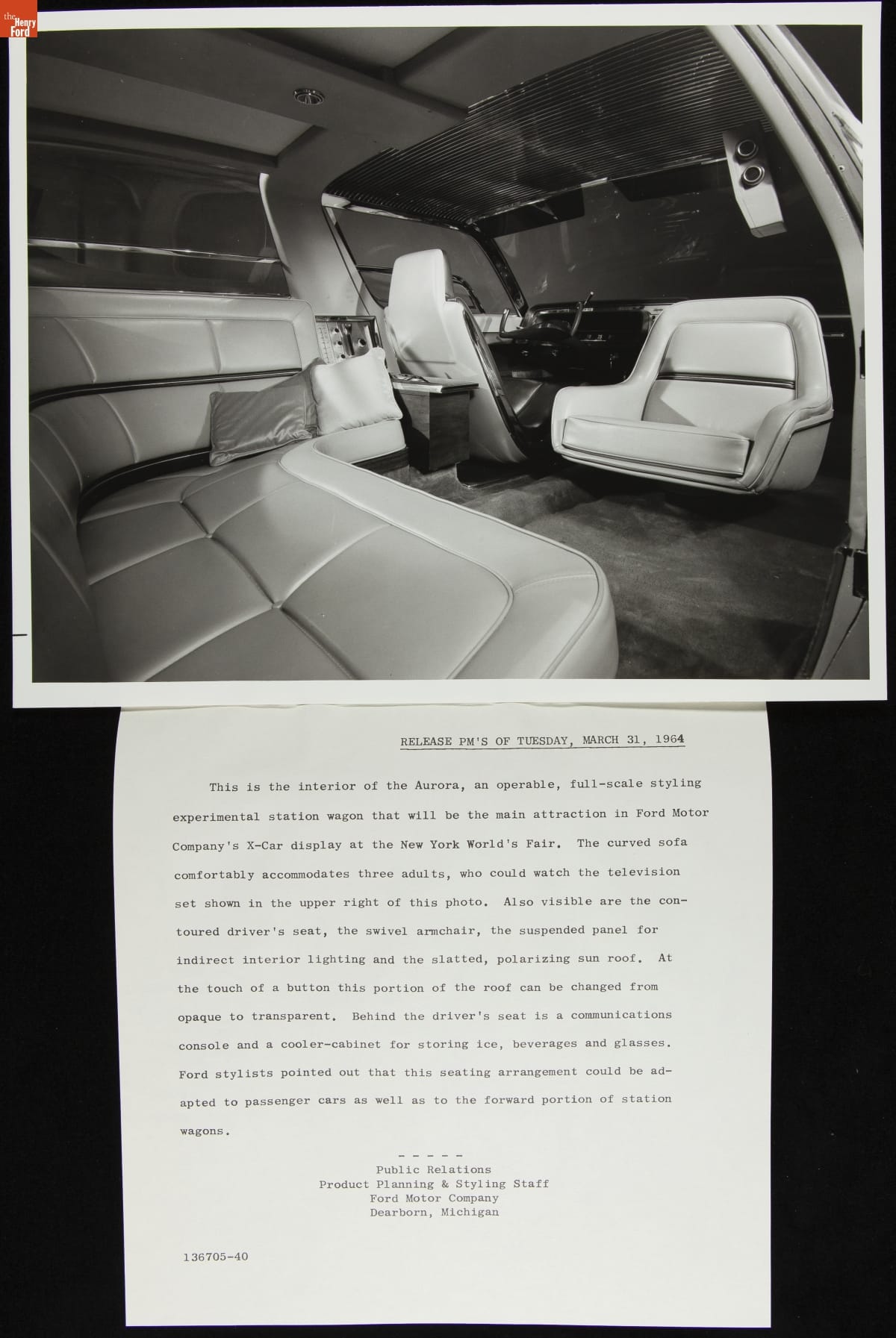 Ford Motor Company introduced its Aurora concept car at the 1964 New York World's Fair. The station wagon's futuristic features included an interior "communications console" that could operate an AM/FM radio, a television set, and a sound-recording device. The Aurora also contained a table with a cabinet for storing ice and beverages.