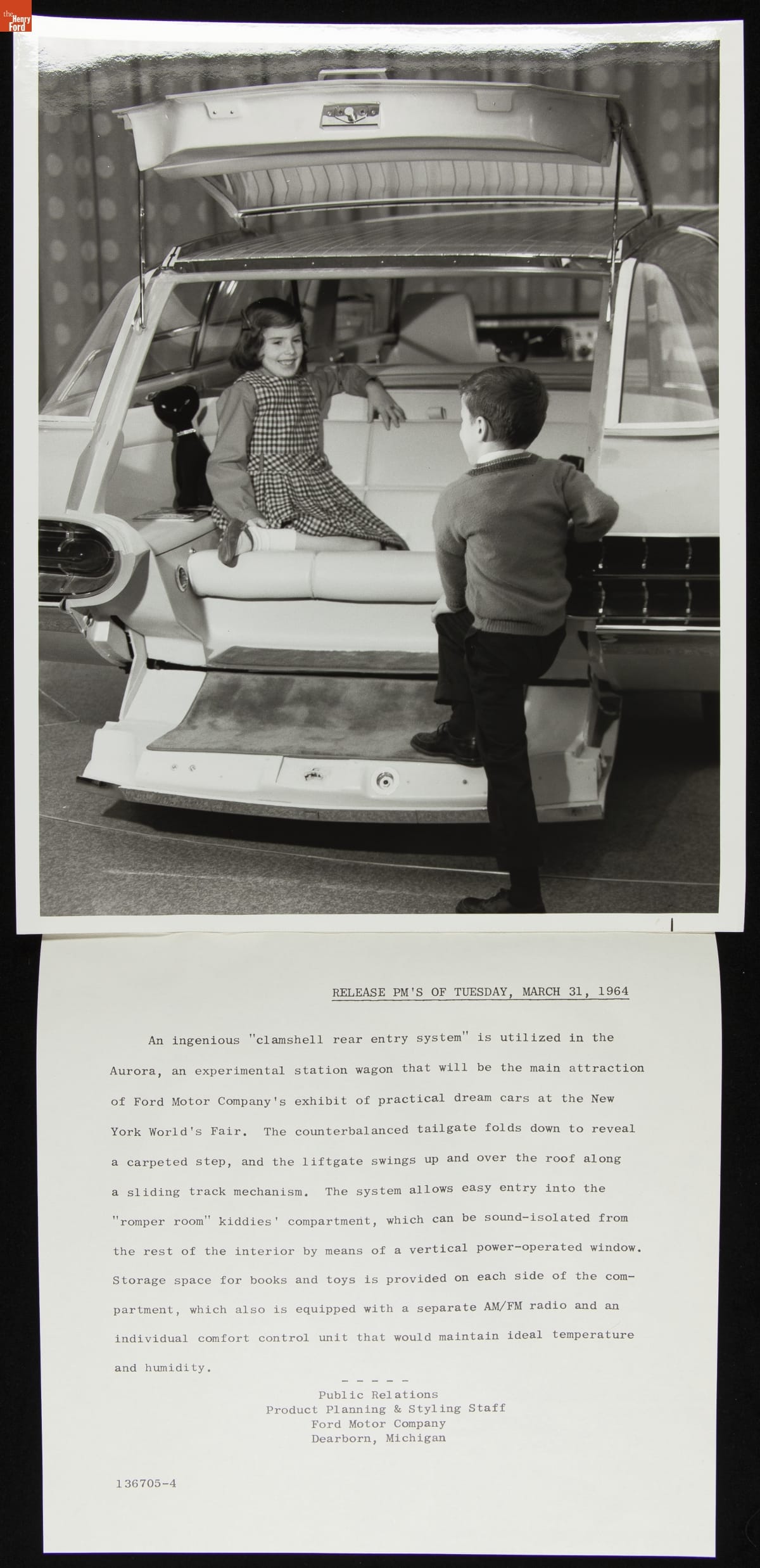 Ford Motor Company introduced the Aurora concept car at the 1964 New York World's Fair. Ford stylists designed the futuristic station wagon with young families in mind. Its clamshell tailgate opened wide for easy access into the rear "children's compartment." This area could be closed off from the rest of the wagon with a soundproof glass partition.