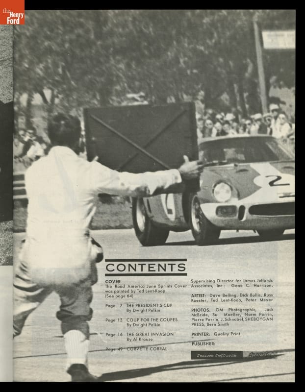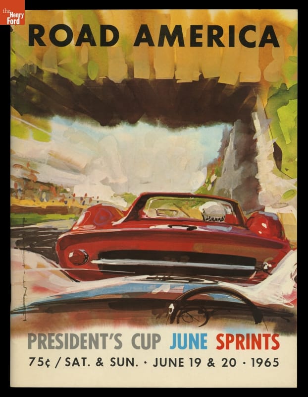 Dave Friedman captured and preserved auto racing history through his photography and memorabilia. His collection of event programs documents key races, cars, drivers, and teams. This program is from the 1965 Road America President's Cup June Sprints, a series of sports car races at Elkhart Lake, Wisconsin. Jim Hall won the main event in the Chevrolet-powered #66 Chaparral 2A.