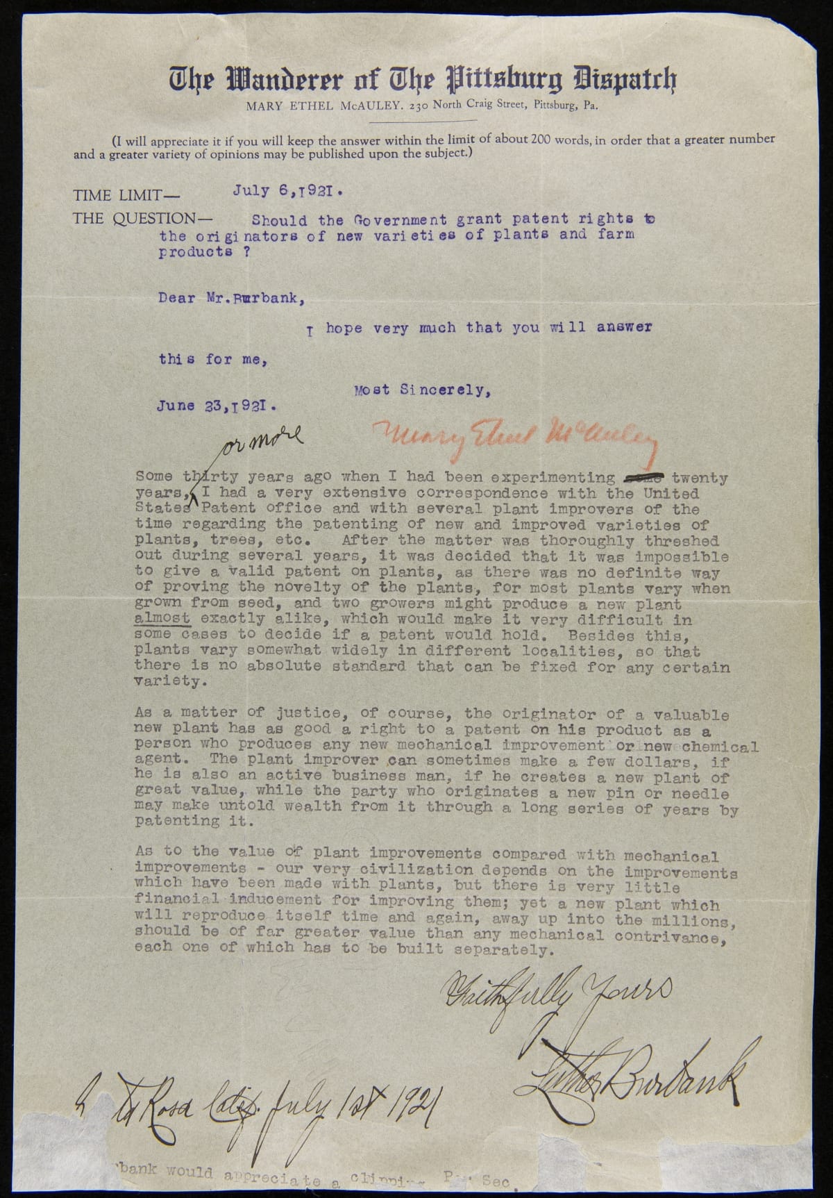 Letter from Luther Burbank to Mary Ethel McAuley of the Pittsburgh Dispatch, July 1, 1921