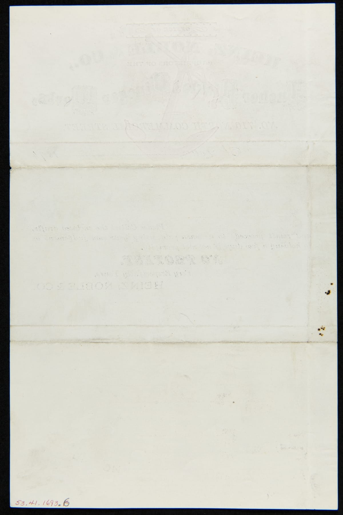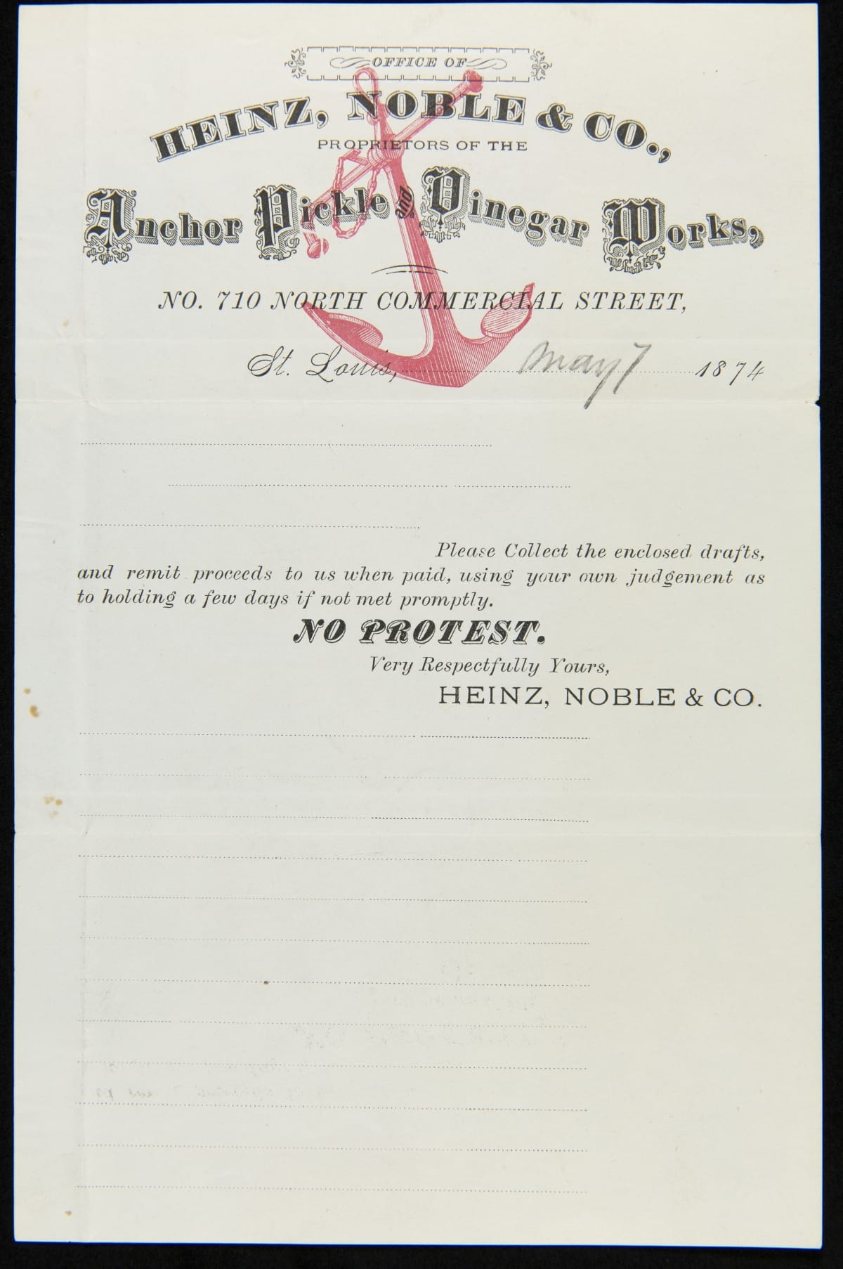 Office of / Heinz, Noble & Co., / Proprietors of the / Anchor Pickle and Vinegar Works, / No. 7 710 North Commercial Street, / St. Louis, May 7 1874 / Please Collect the enclosed drafts, / and remit proceeds to us when paid, using your own judgement as / to holding a few days if not met promptly. / No Protest. / Very Respectfully Yours, / Heinz, Noble & Co.
