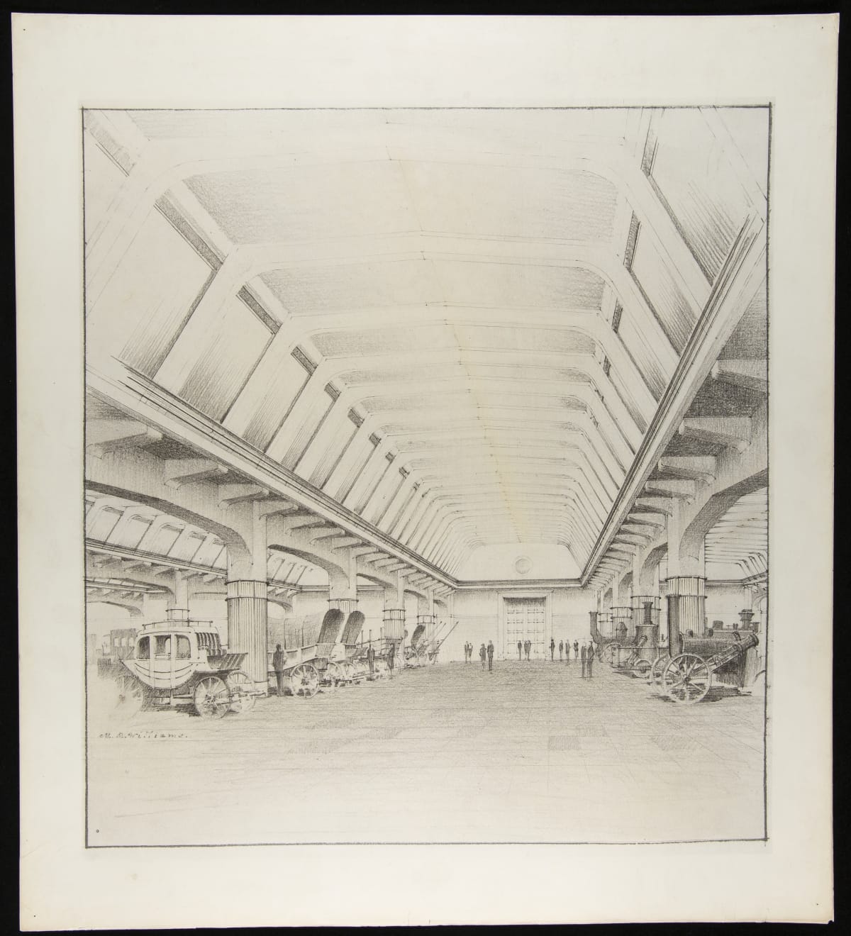One of a series of views of the Museum as built, this black and white drawing shows the exhibit gallery, or Machine Hall, as architect Robert O. Derrick described it. The unique shed-like ceiling with skylights, echoes Albert Kahn's Ford Engineering Laboratory, completed in 1923. Unlike today, artifacts were arranged in lines by type; shown here, wagons and steam engines.