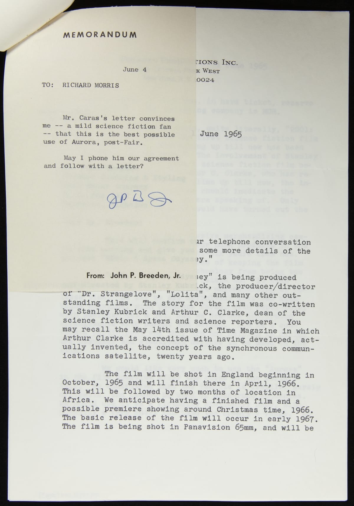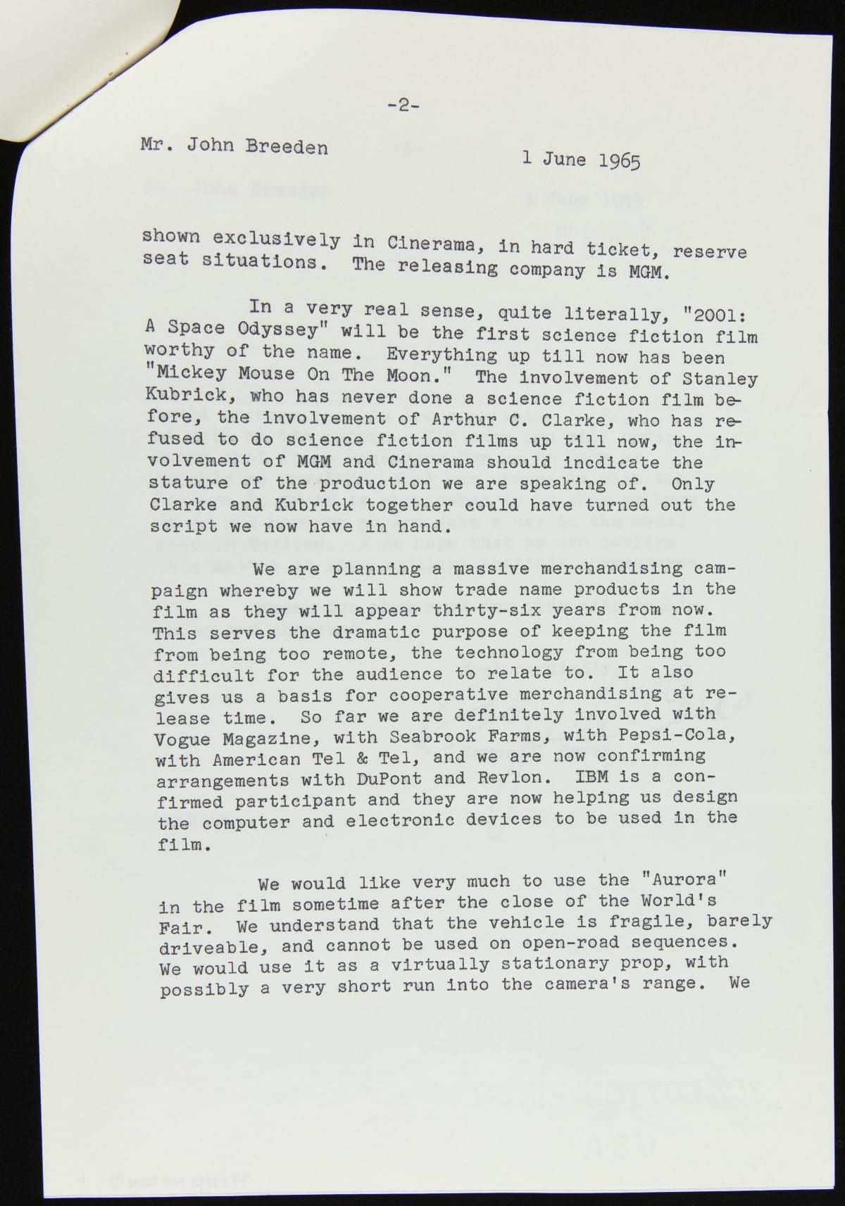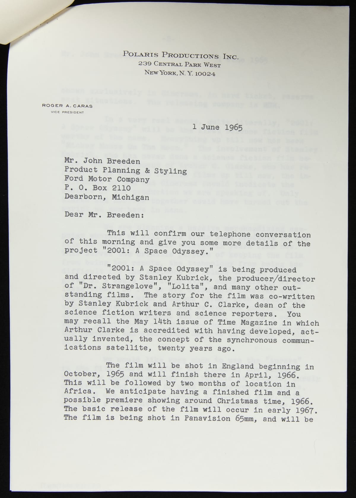 Correspondence between John Breeden, Jr. and Roger A. Caras regarding Ford Aurora in "2001: Space Odyssey," June, 1965