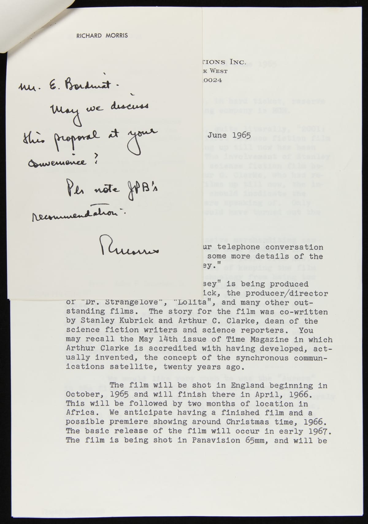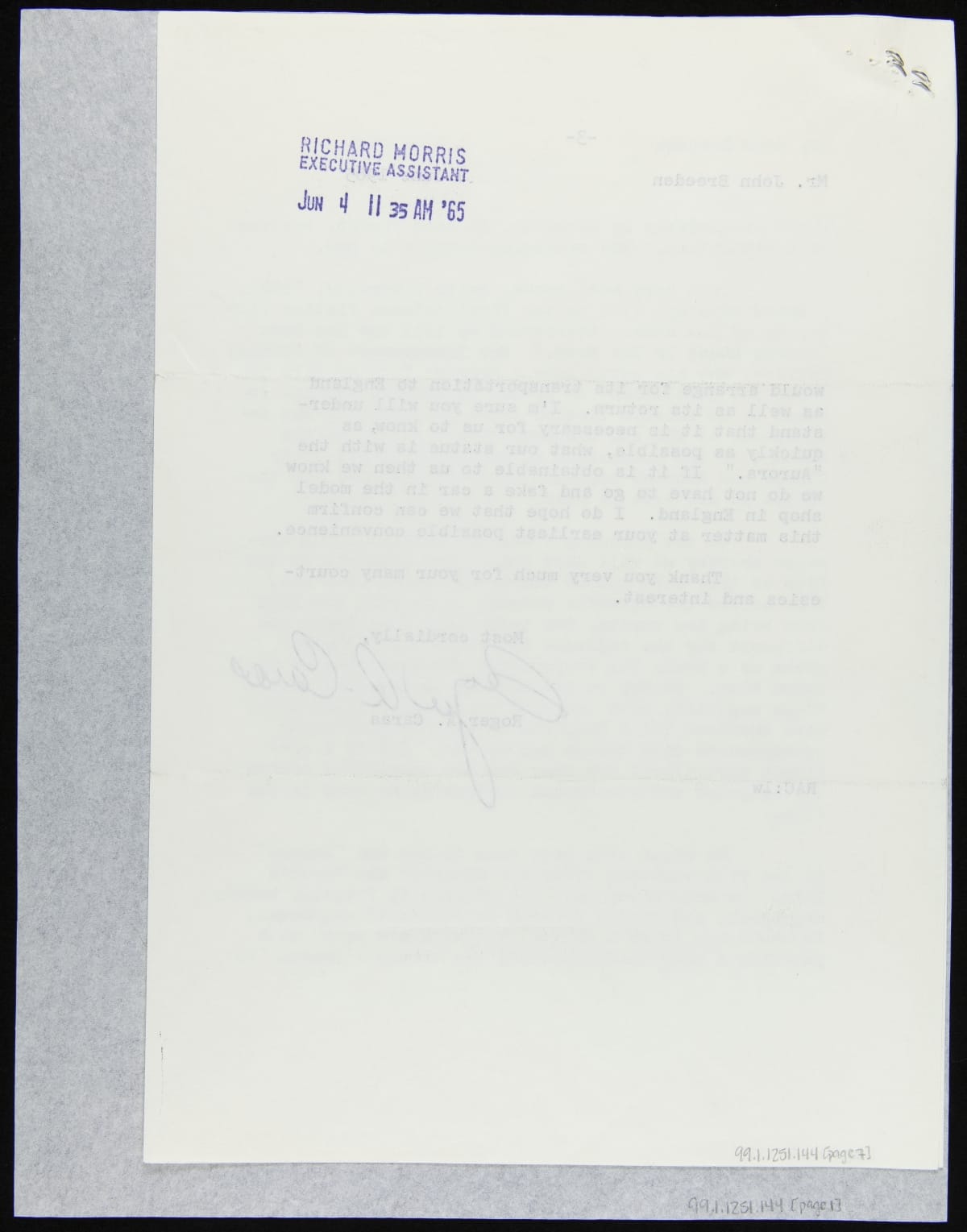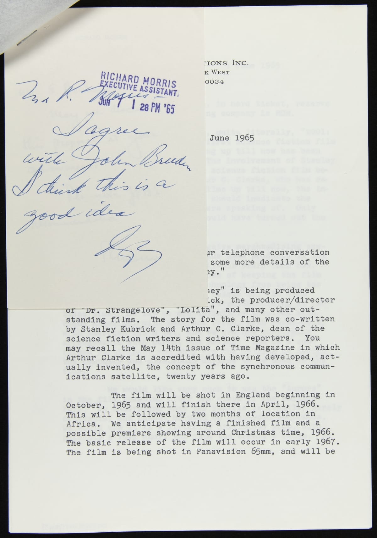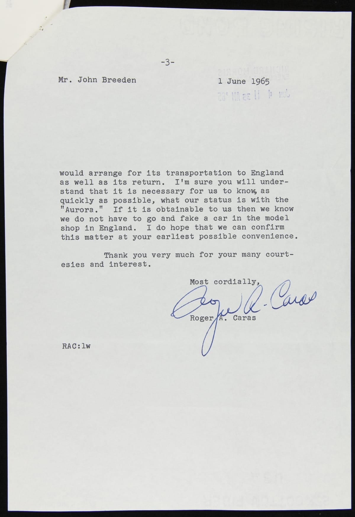 Correspondence between John Breeden, Jr. and Roger A. Caras regarding Ford Aurora in "2001: Space Odyssey," June, 1965
