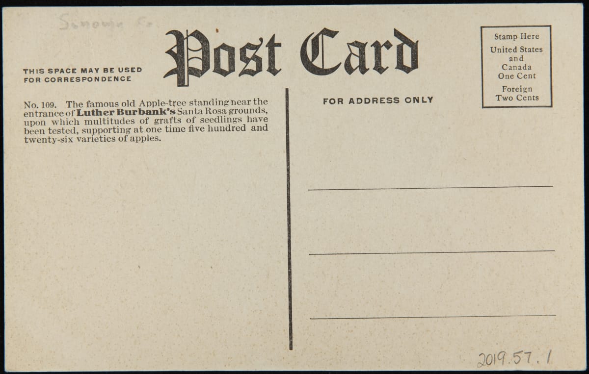 Luther Burbank (1849-1926), an American horticulturalist and author, gained a reputation for selective breeding that yielded more than 800 new fruits, vegetables, flowers, and other plants. By 1906, Burbank's international fame had brought multiple solicitors to his home in Santa Rosa, California, interested in documenting his work. A deal with Minneapolis publisher Dugal Cree resulted in this promotional postcard.