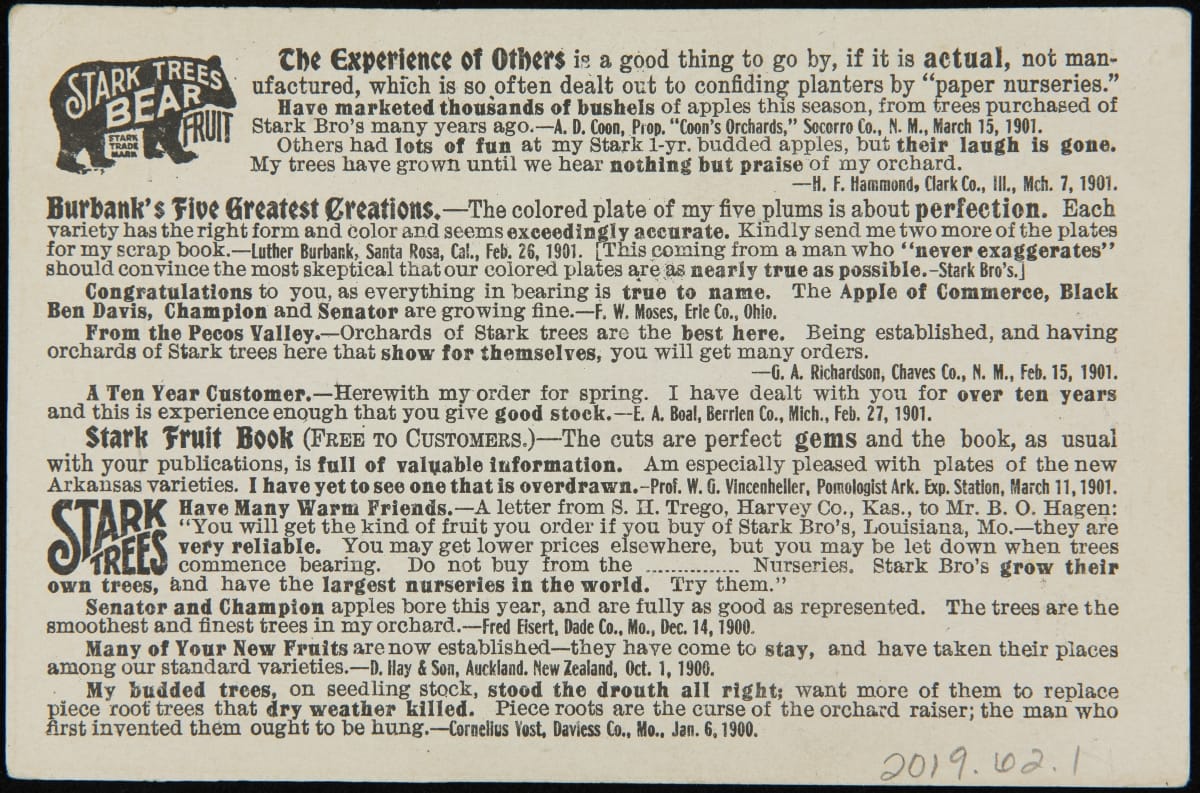 Luther Burbank's 1893 catalog, New Creations in Fruits and Flowers, captured the attention of established nursery businesses, including Stark Brothers Nurseries in Missouri. Clarence Stark traveled to California to see Burbank's creations for himself and purchased the rights to sell some of Burbank's plum varieties. This began an exclusive distribution partnership that continued after Burbank's death.