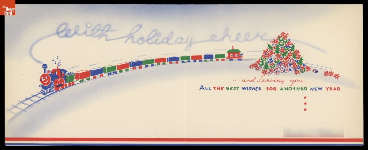 Railroads found a place in American traditions surrounding the holiday season. Trains became synonymous with trips to visit loved ones, and electric train sets became staples under the Christmas tree as decorations and gifts. More recently, movies like The Polar Express reinforced the connection. This holiday greeting card embraced the longstanding ties between yuletide and railroading.
