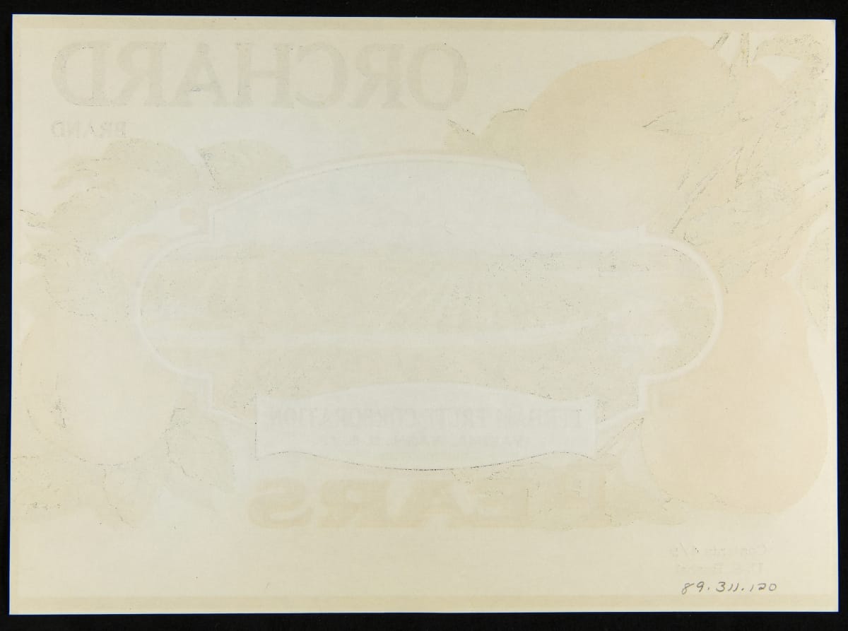 In 1869, the transcontinental railroad opened eastern markets to the West Coast produce industry for the first time. As produce companies shipped crates of fruits and vegetables across the country, they needed a way to distinguish their goods from their competitors'. Colorful, eye-catching labels, like this one for Orchard Brand Pears, were created to attract grocers purchasing goods from wholesale markets.