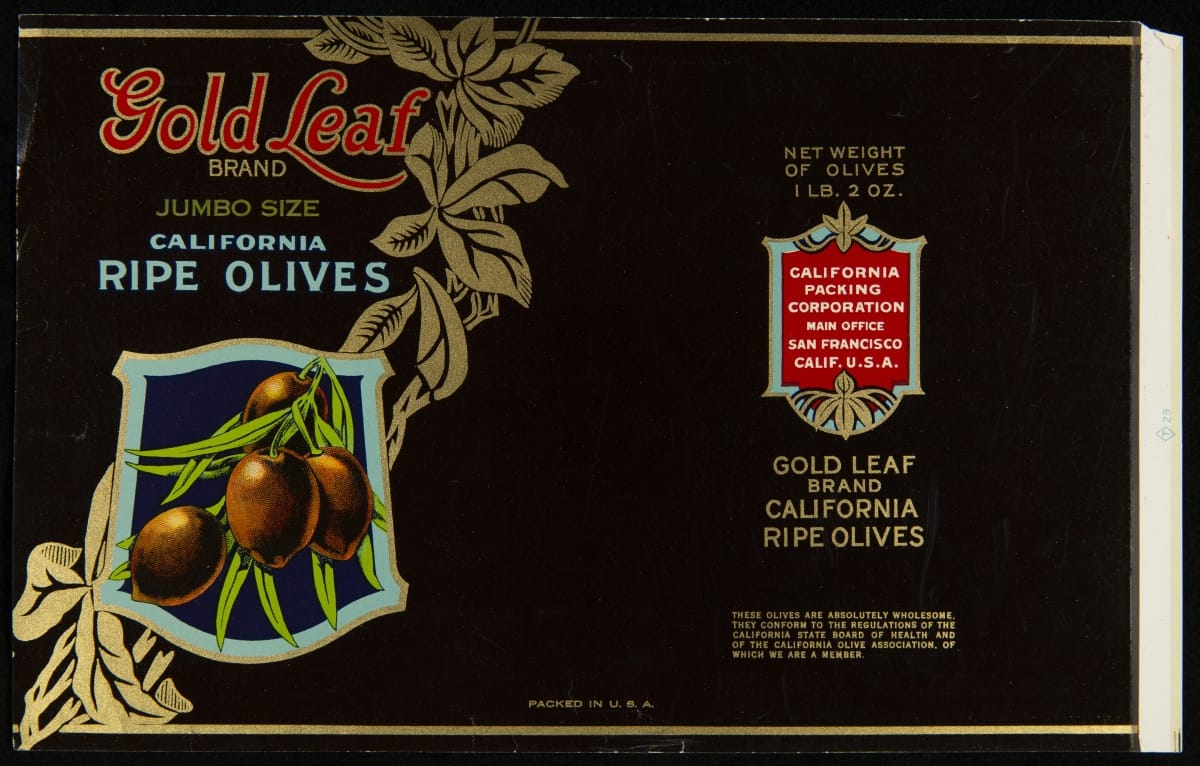 Gold Leaf / Brand / Jumbo size / California / Ripe Olives / California / Packing / Corporation / Main Office / San Francisco / Calif. U. S. A. / These olives are absolutely wholesome. / They conform to the regulations of the / California state board of health and / of the California Olive Association. Of / which we are a member.
