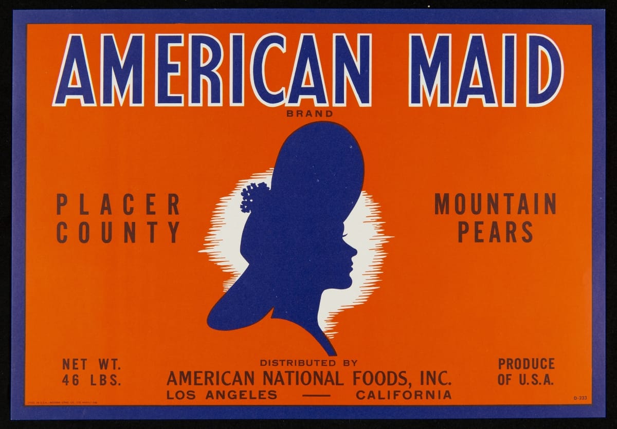In 1869, the transcontinental railroad opened eastern markets to the West Coast produce industry for the first time. As produce companies shipped crates of fruits and vegetables across the country, they needed a way to distinguish their goods from their competitors'. Colorful, eye-catching labels, like this one for American Maid Brand Placer County Mountain Pears, were created to attract grocers purchasing goods from wholesale markets.