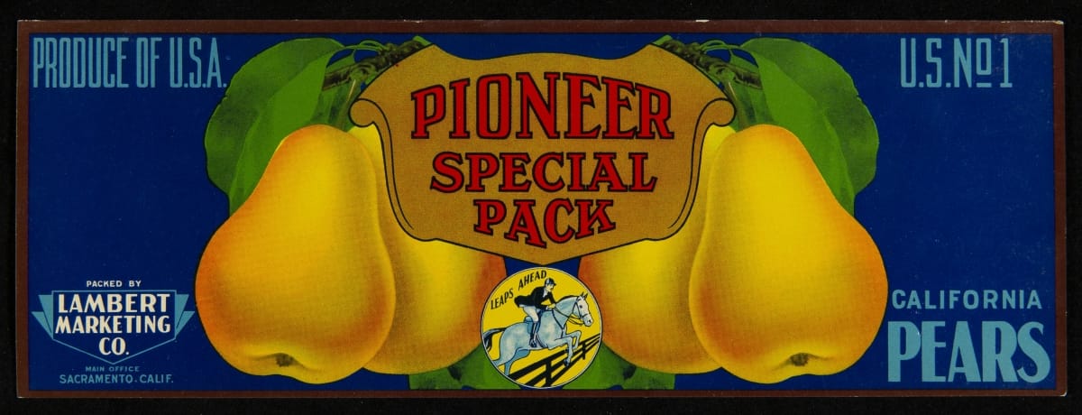 In 1869, the transcontinental railroad opened eastern markets to the West Coast produce industry for the first time. As produce companies shipped crates of fruits and vegetables across the country, they needed a way to distinguish their goods from their competitors'. Colorful, eye-catching labels, like this one for Pioneer Special Pack Brand California Pears, were created to attract grocers purchasing goods from wholesale markets.