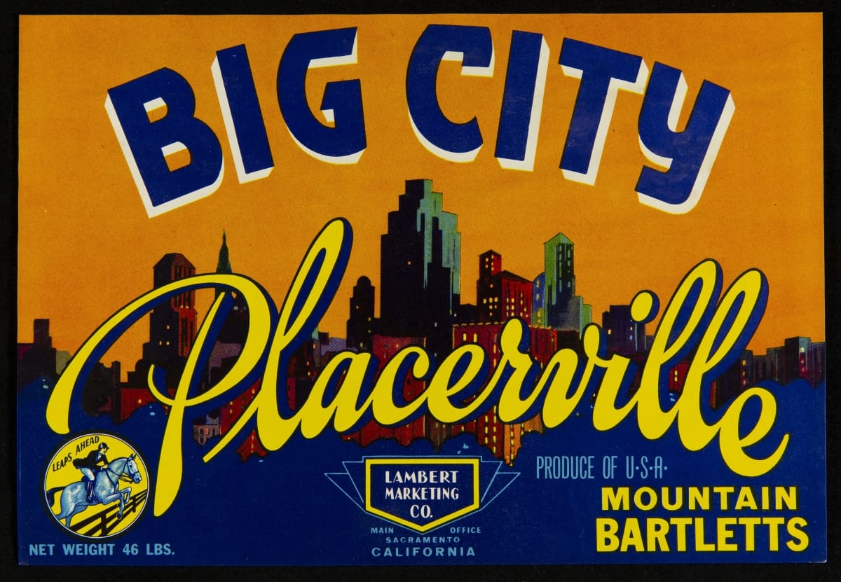 In 1869, the transcontinental railroad opened eastern markets to the West Coast produce industry for the first time. As produce companies shipped crates of fruits and vegetables across the country, they needed a way to distinguish their goods from their competitors'. Colorful, eye-catching labels, like this one for Big City Brand Mountain Bartlett Pears, were created to attract grocers purchasing goods from wholesale markets.