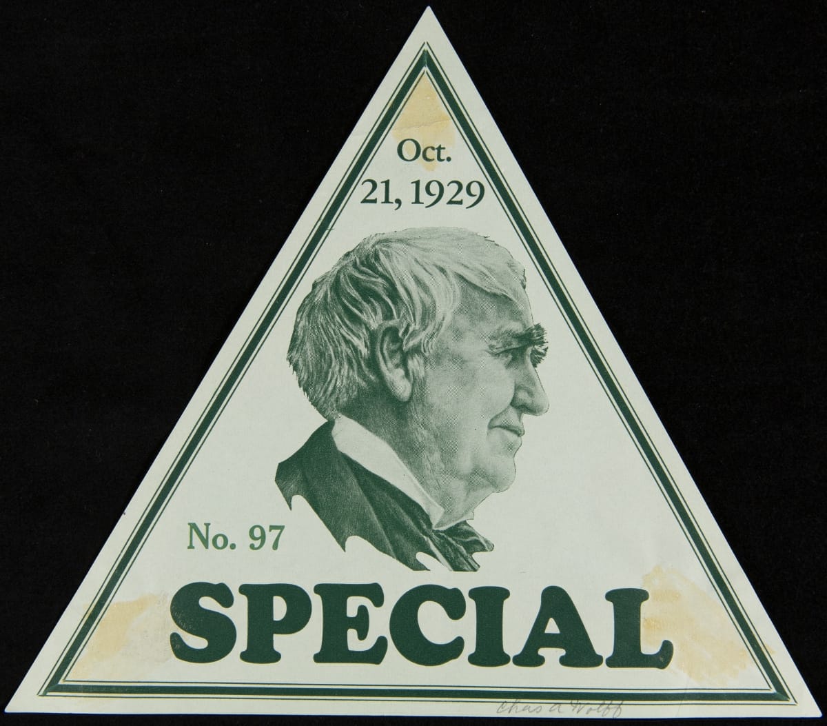 On October 21, 1929, Henry Ford hosted an event, Light's Golden Jubilee, which celebrated the 50th anniversary of Thomas Edison's invention of the incandescent lamp. The event also served as the official dedication of The Edison Institute, Ford's museum complex named in honor of his friend. Automobiles used to transport special guests during the day's events had a window sticker such as this one placed on their windshields.
