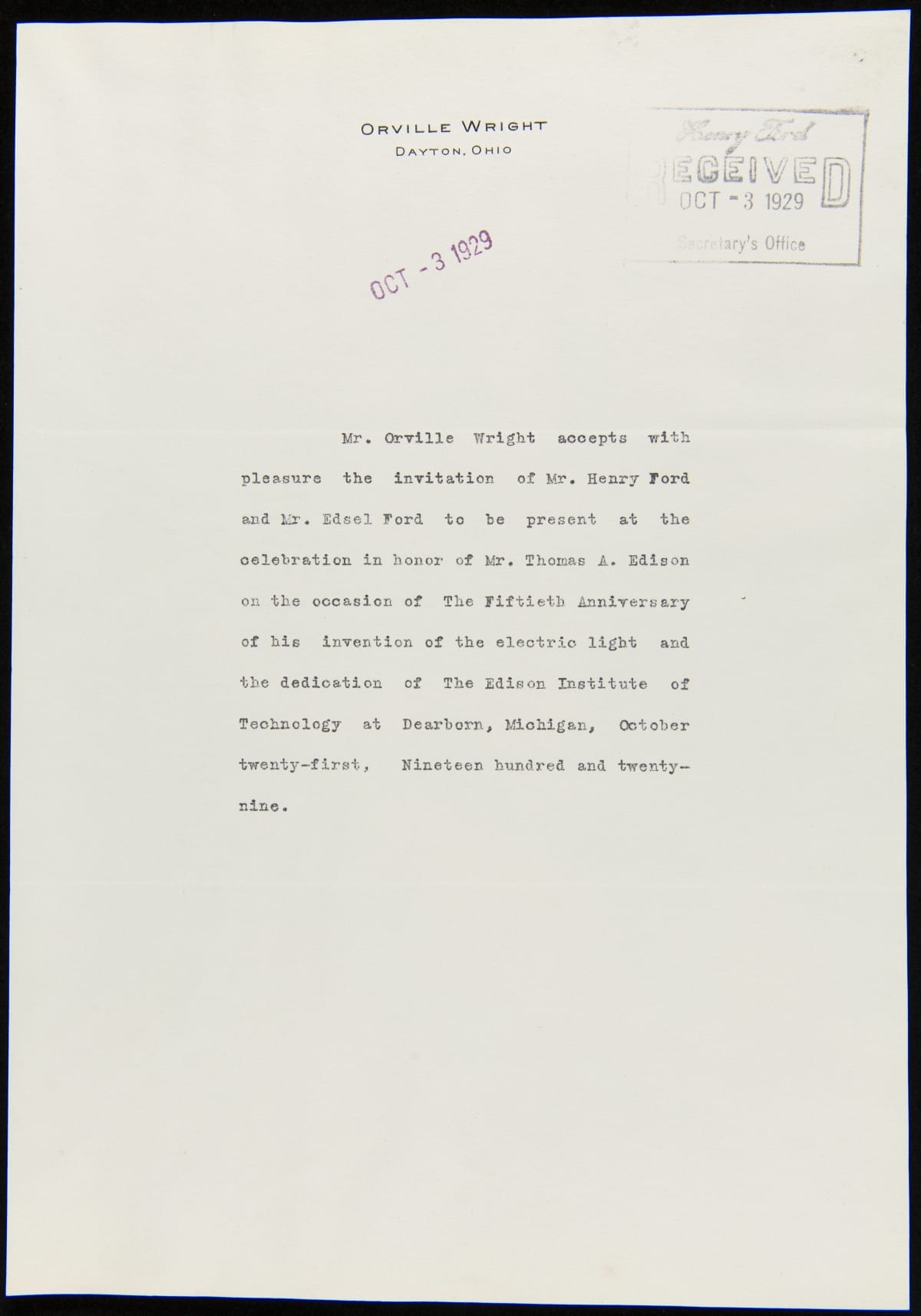 Letter from Orville Wright to Henry Ford and Edsel Ford regarding Invitation to Light's Golden Jubilee, October 1929