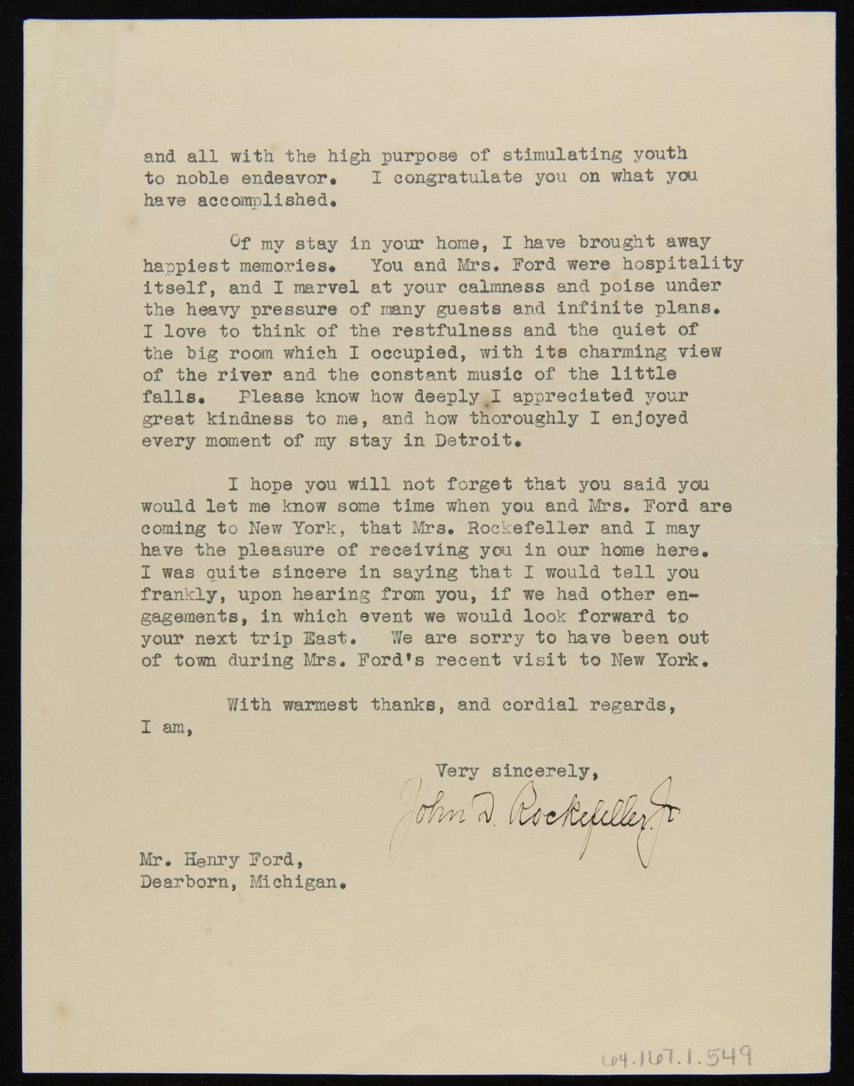 On October 21, 1929, Henry Ford hosted an event, Light's Golden Jubilee, which celebrated the 50th anniversary of Thomas Edison's invention of the incandescent lamp. John D. Rockefeller, Jr., had planned to stay with Edsel Ford, but when Edsel's son was taken ill, Henry and Clara Ford invited Rockefeller to stay with them. In this letter, Rockefeller thanked the Fords for their "great kindness and delightful hospitality."