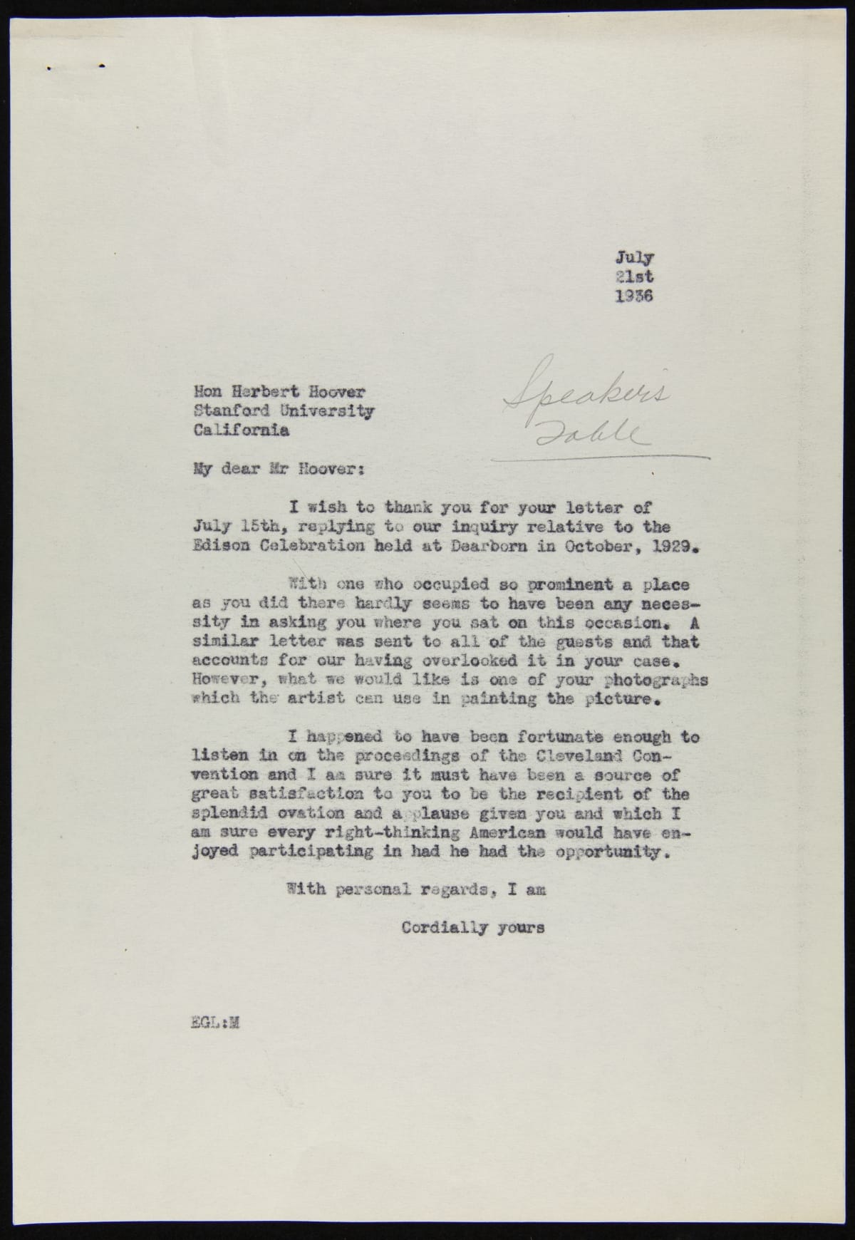 In the mid-1930s, more than six years after the Light's Golden Jubilee celebration, Henry Ford commissioned a panoramic painting of that evening's banquet. Letters were sent to attendees -- including the special guests at the head table -- asking them to indicate on an enclosed diagram where they sat during the event. Former President Herbert Hoover reported his position in this polite and succinct letter.