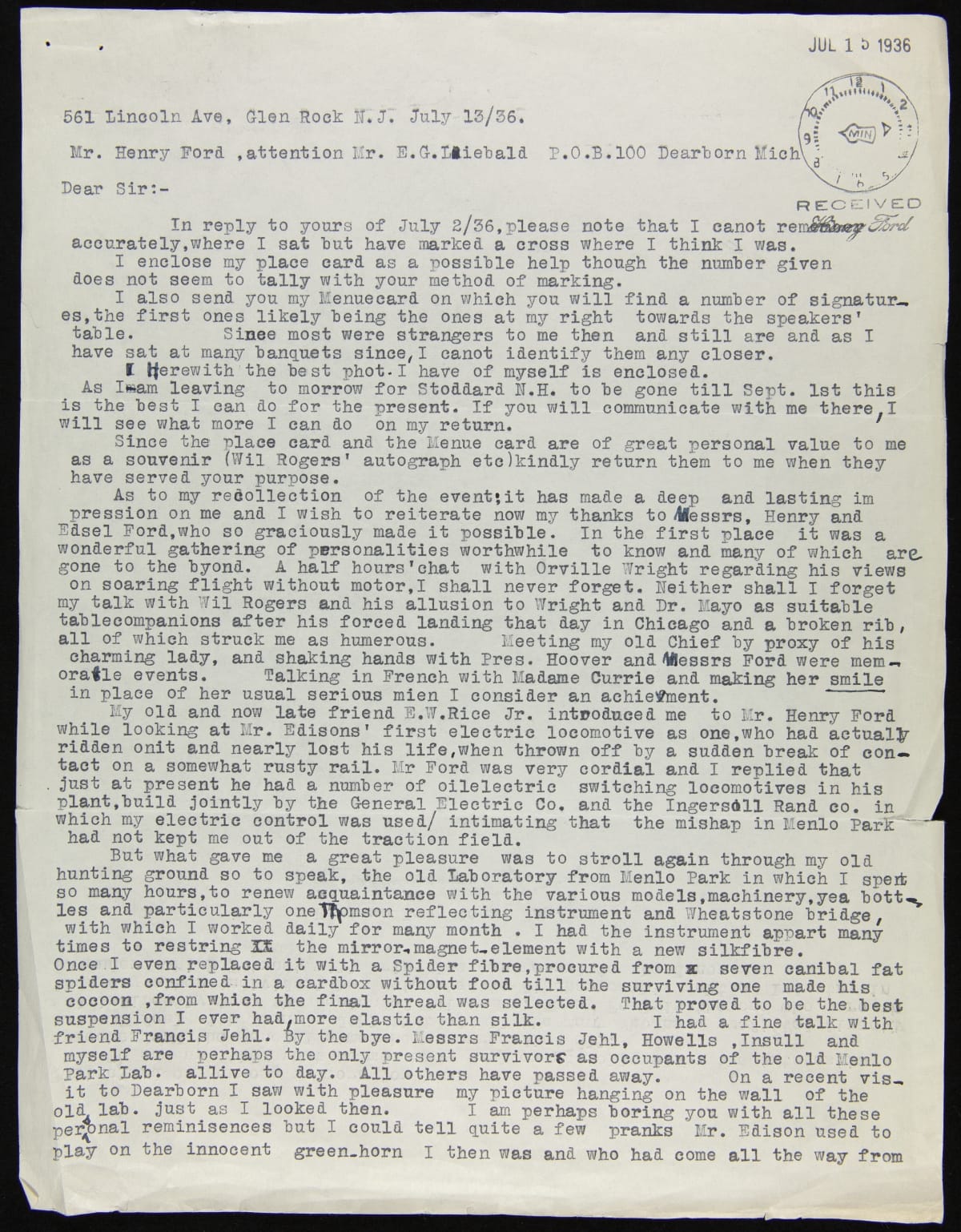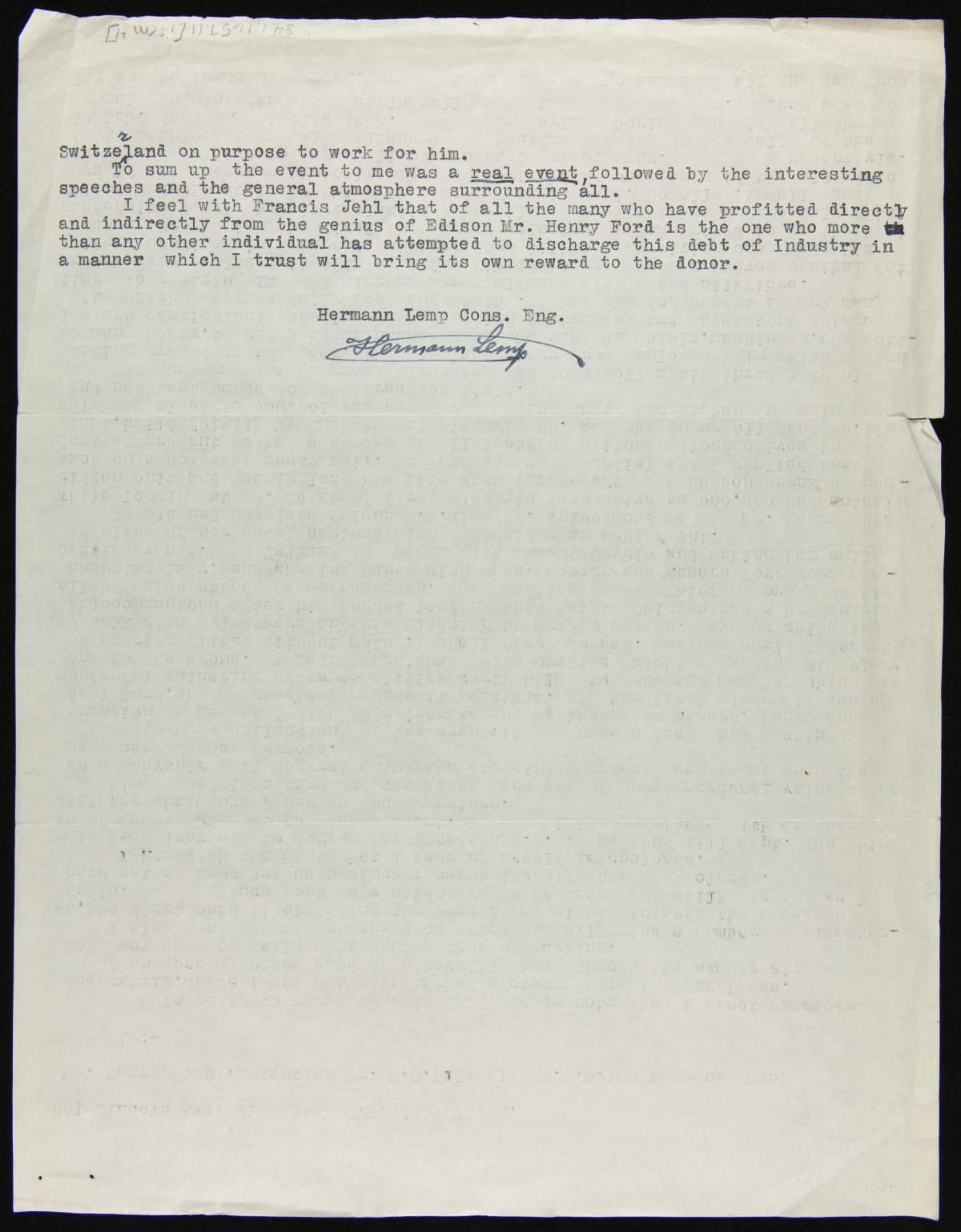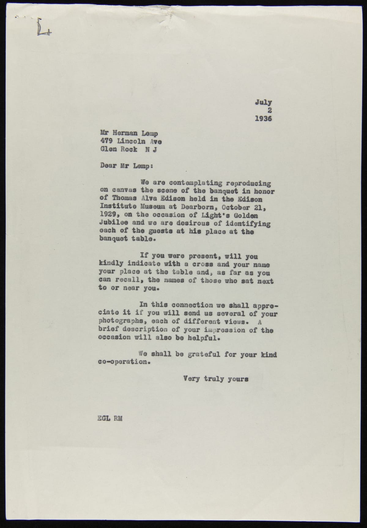 In the mid-1930s, more than six years after the Light's Golden Jubilee celebration, Henry Ford commissioned a panoramic painting of that evening's banquet. Letters were sent to attendees asking them to indicate on an enclosed diagram where they sat and for a photograph so that their image could be included in the painting. Hermann Lemp complied and added his personal recollections of that evening's events.
