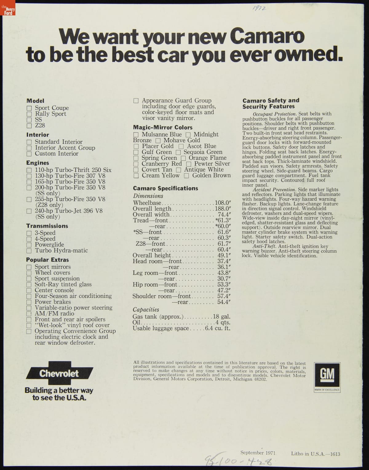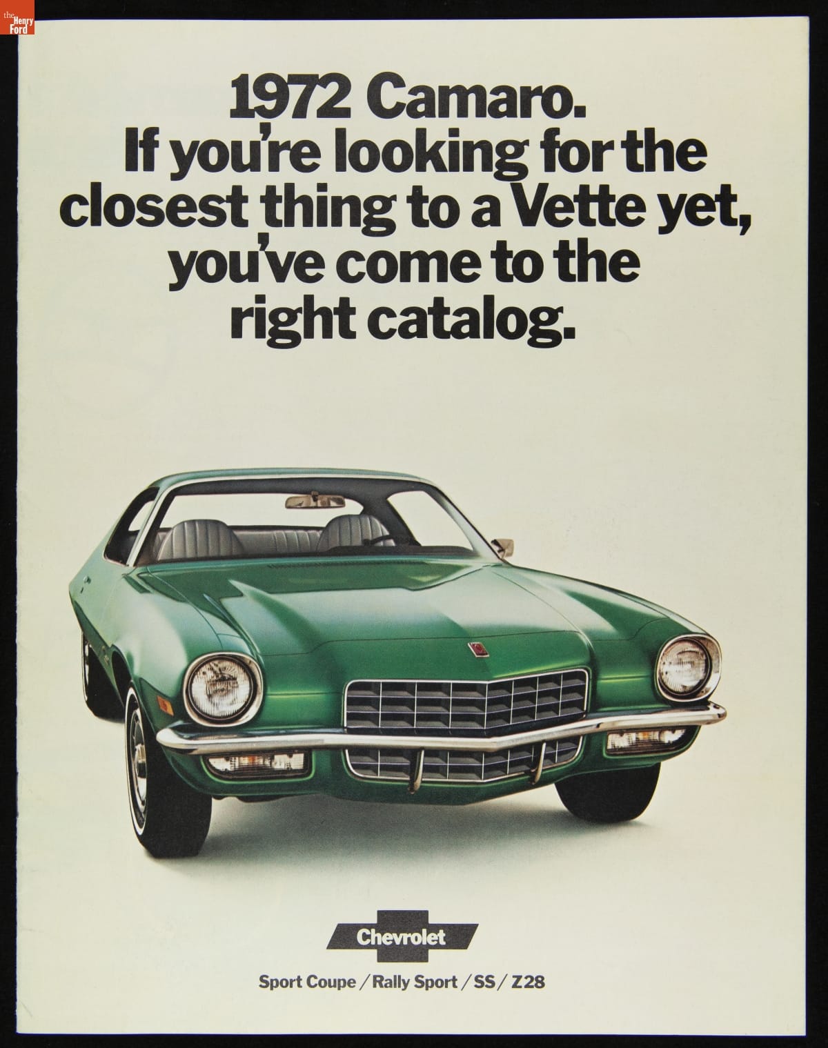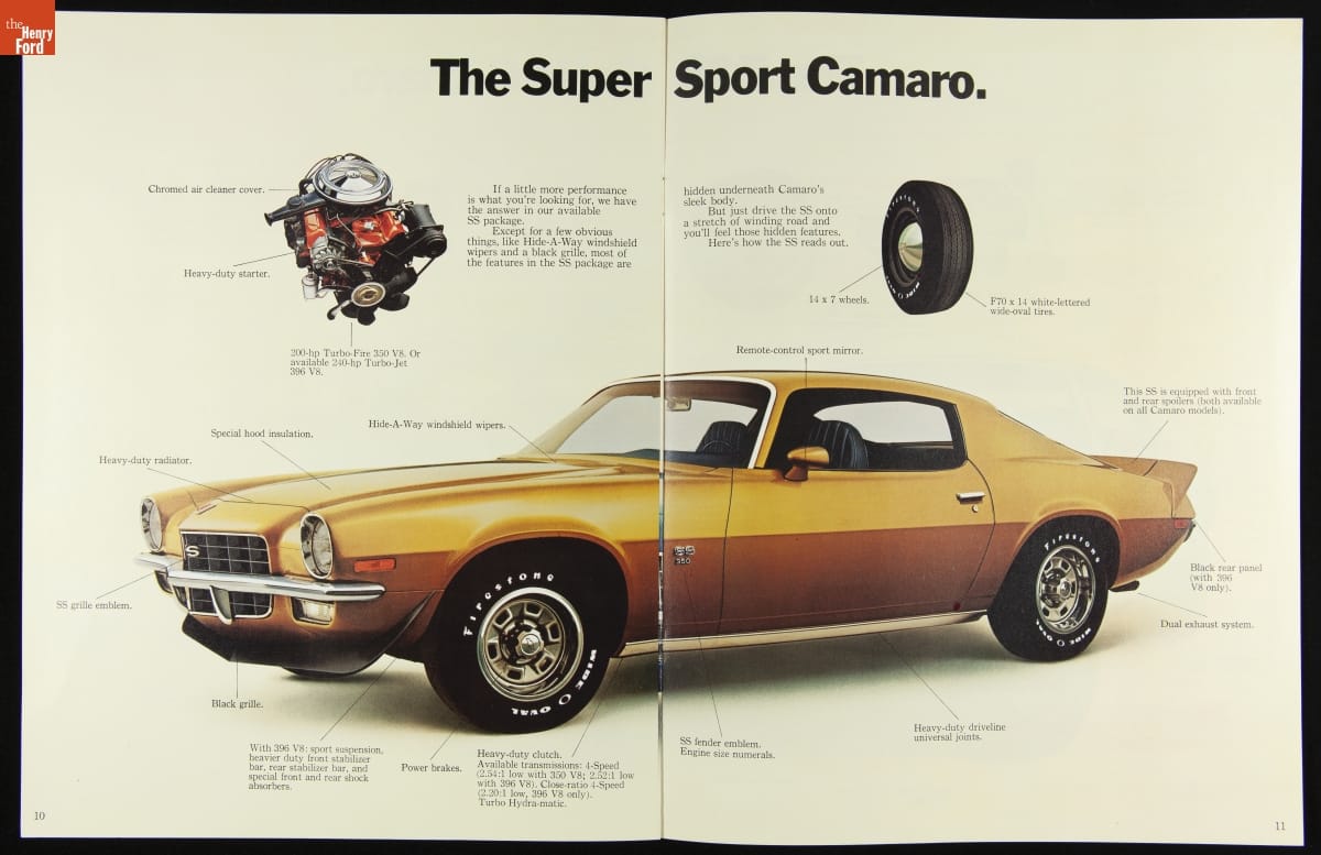 Introduced for 1967, the Chevrolet Camaro was General Motors' first entry into the sporty "pony car" market created by the Ford Mustang. Camaro was in its second styling generation by 1972. Updates for the model year included a revised grille and higher backs on the bucket seats. This sales catalog compared Camaro favorably with its upmarket sibling, Chevrolet's Corvette.