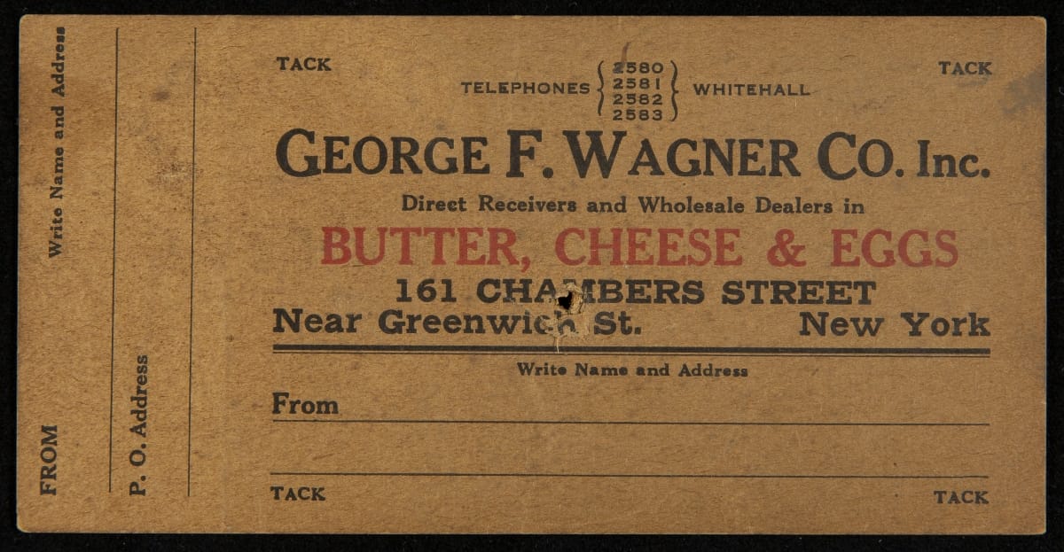Companies created distinctive labels to identify their products and communicate shipping information to ensure quick delivery to their clients. This was especially important for perishable commodities, such as the "butter, cheese & eggs" sold by the George F. Wagner Co. Inc. in New York City.