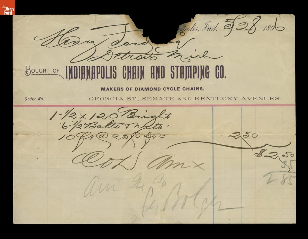 Clara Ford saved this 1896 receipt. The purchase included 10 feet of bicycle chain -- possibly the chain Henry used in the drivetrain of his Quadricycle.