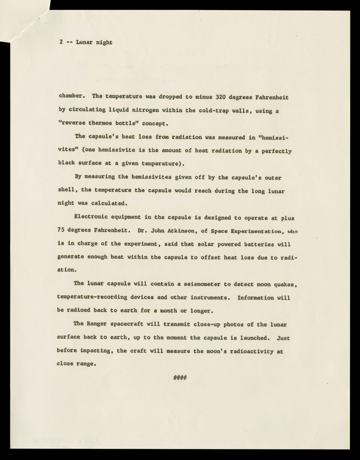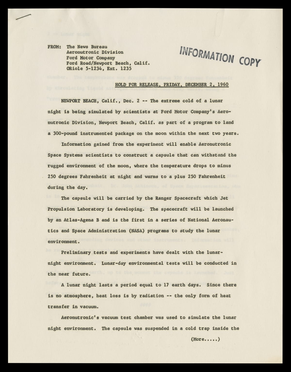 Press Release RE: Lunar Capsule Built by Ford Motor Company Aeronutronic Division, December 2, 1960