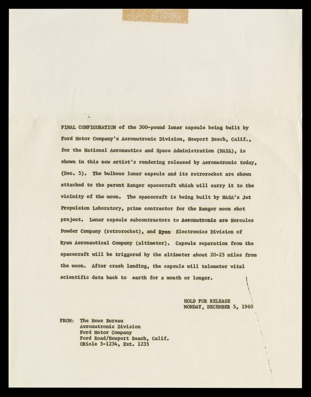 Artist's Rendering of Lunar Capsule Built by Ford Motor Company Aeronutronic Division, 1960
