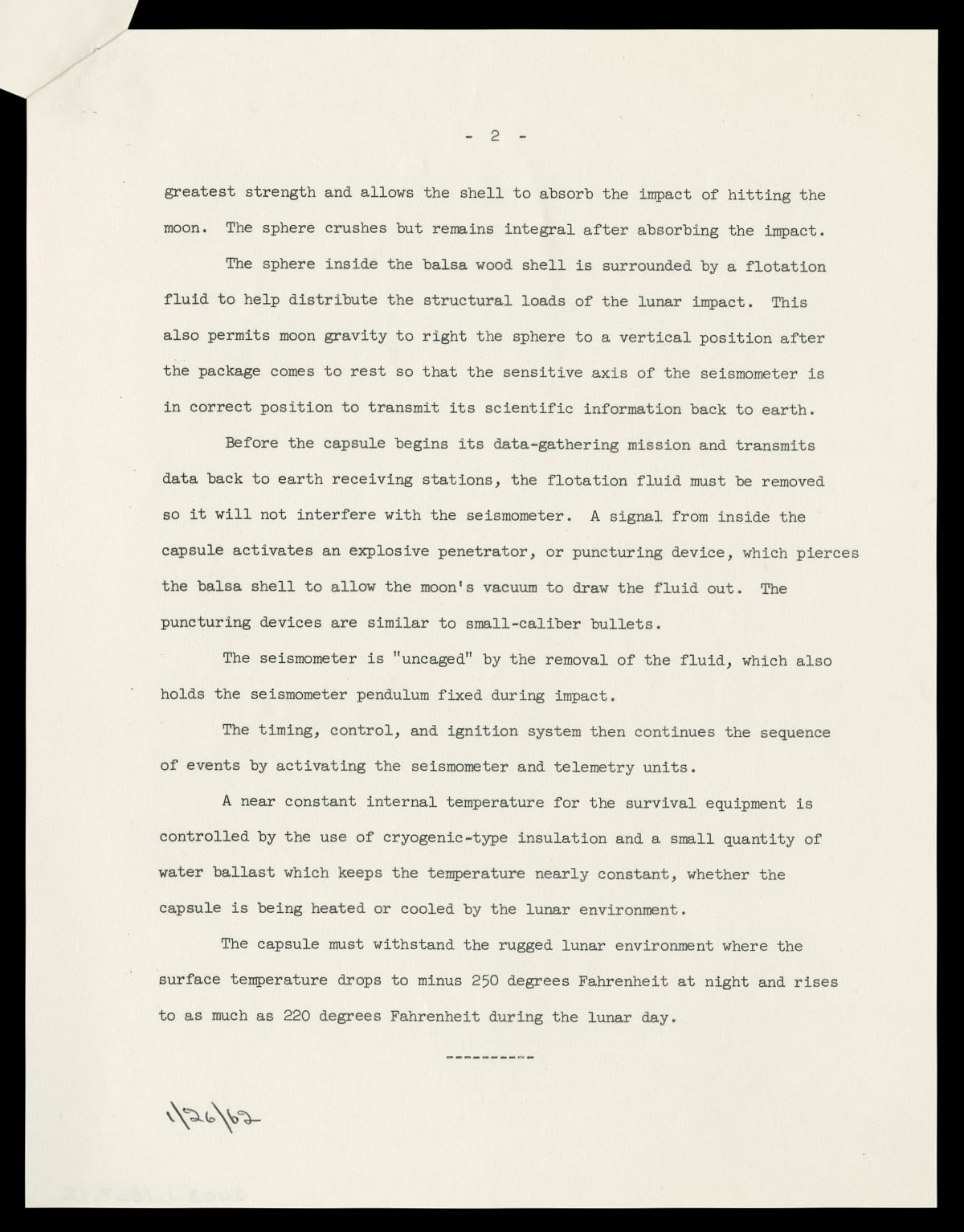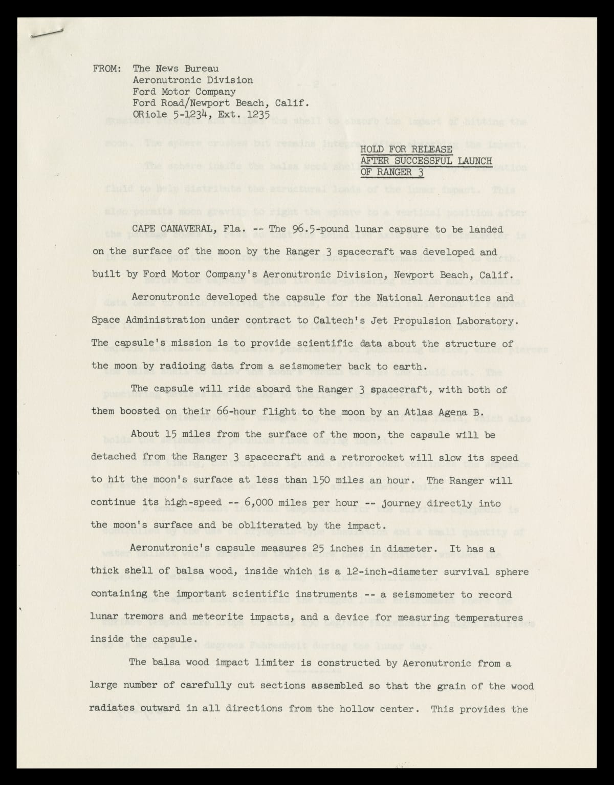 Press Release RE: Lunar Capsule Built by Ford Motor Company Aeronutronic Division, January 26, 1962