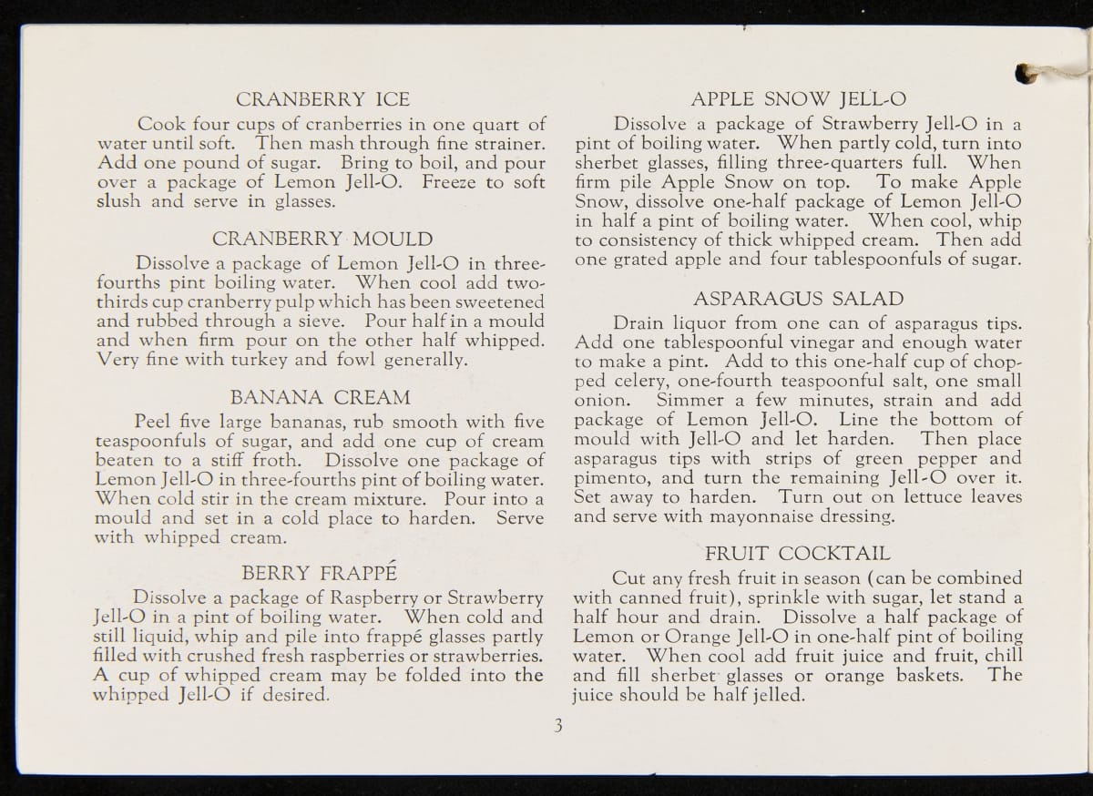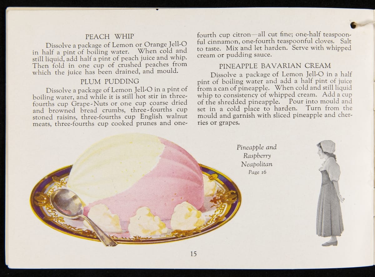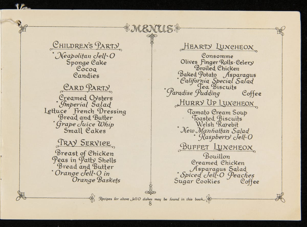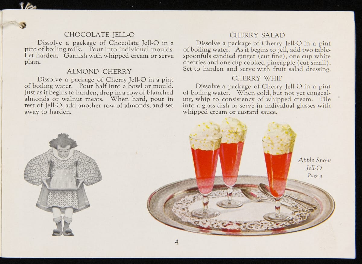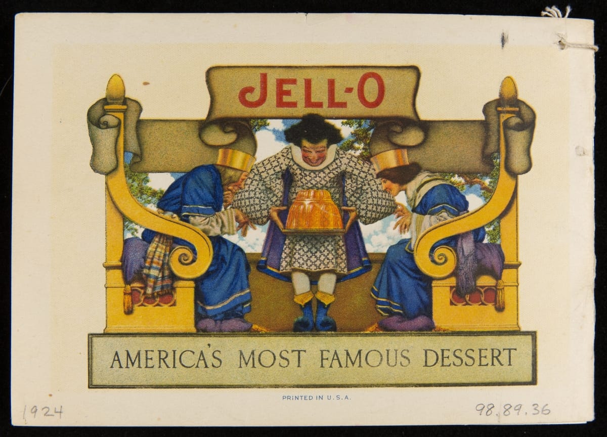 After acquiring the rights to Jell-O from Pearle Wait in 1899, Orator F. Woodward produced recipe booklets to gather interest in the product. The booklets proved to be an invaluable marketing strategy, providing homemakers with creative uses for the ready-made product. For some marketing campaigns, Jell-O enlisted prominent artists such as Maxfield Parrish, who designed several images featured in this book.