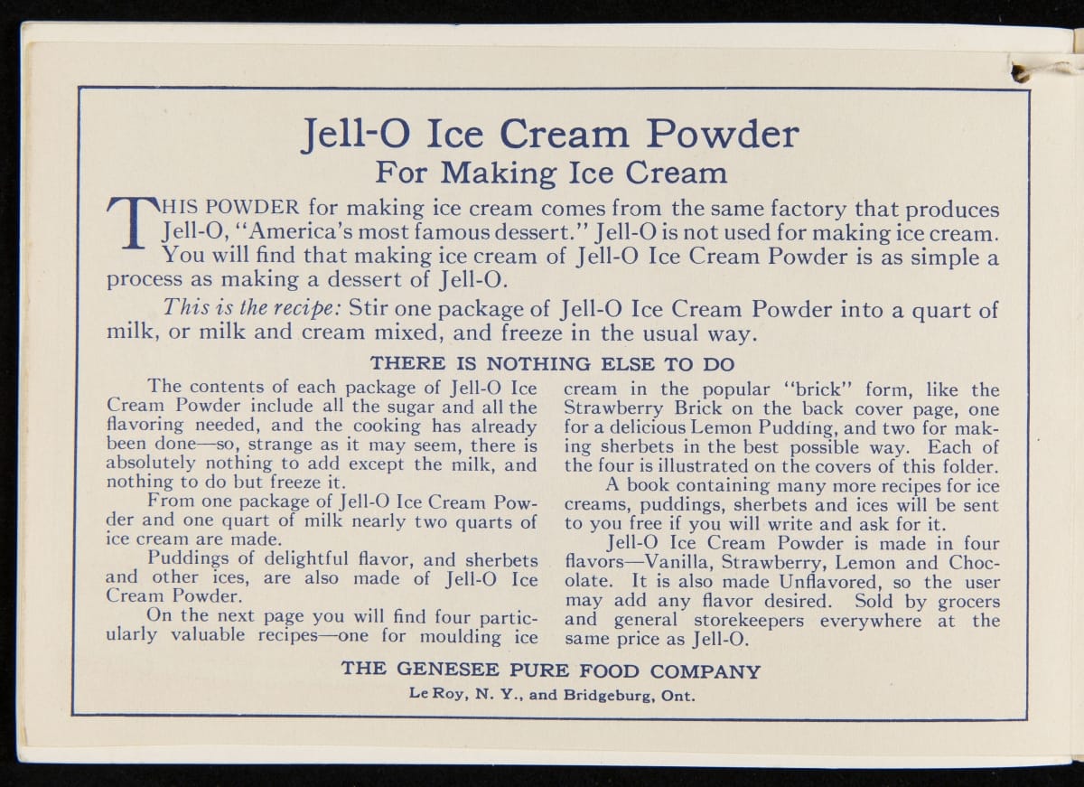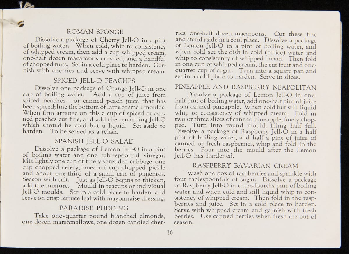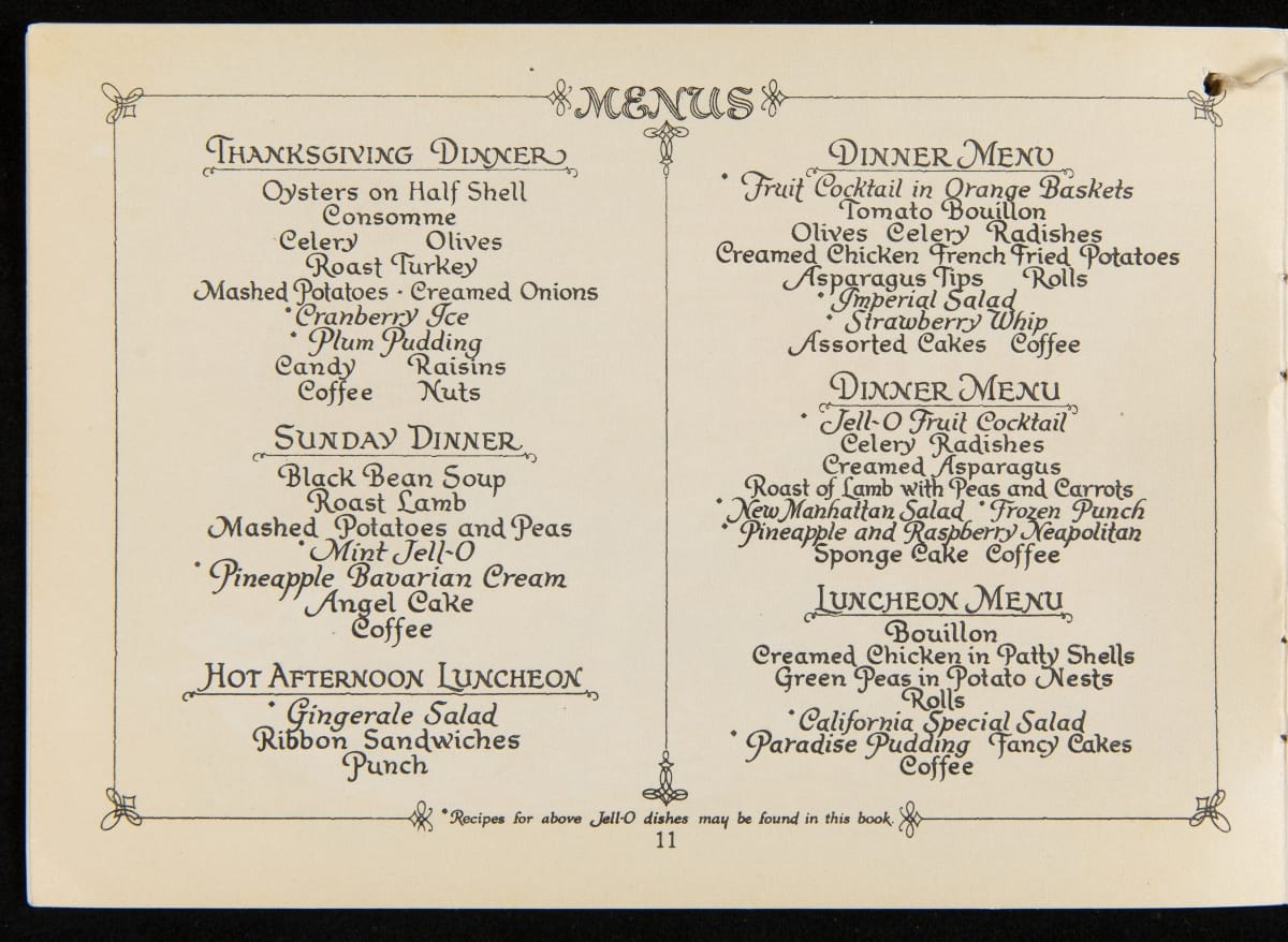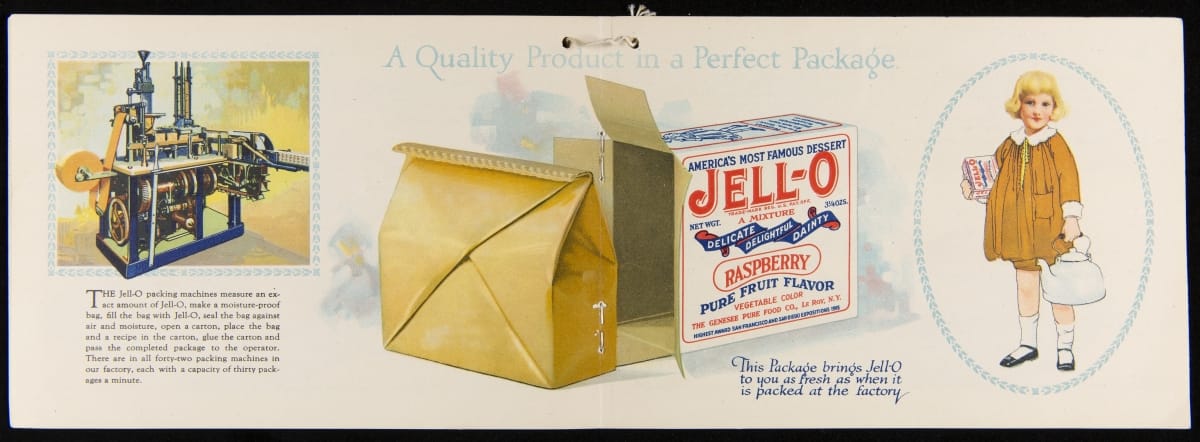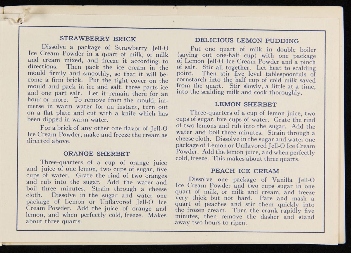 After acquiring the rights to Jell-O from Pearle Wait in 1899, Orator F. Woodward produced recipe booklets to gather interest in the product. The booklets proved to be an invaluable marketing strategy, providing homemakers with creative uses for the ready-made product. For some marketing campaigns, Jell-O enlisted prominent artists such as Maxfield Parrish, who designed several images featured in this book.