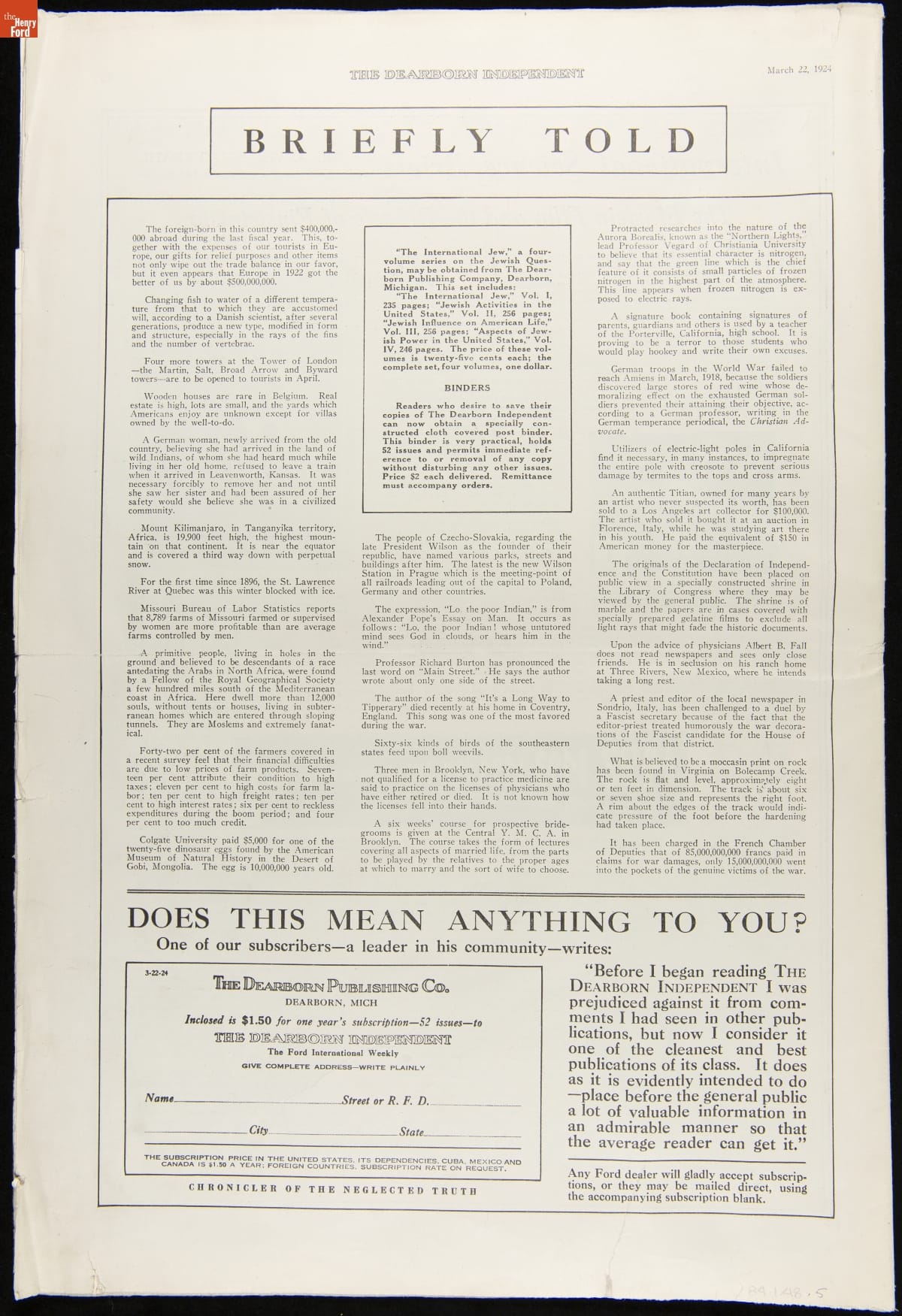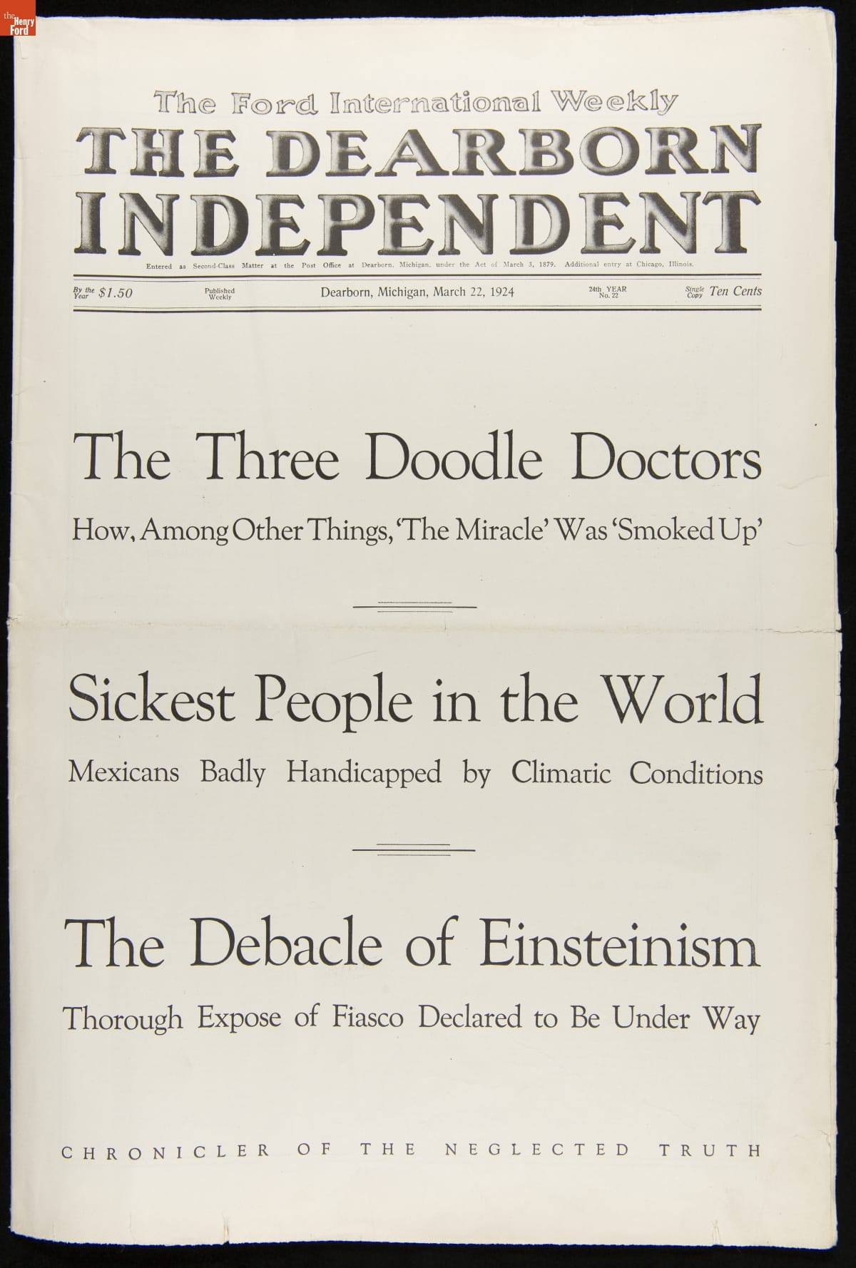 Henry Ford purchased The Dearborn Independent and published it under his name from 1919 to 1927. It served as a forum for Ford's views, free from other media outlets that had attacked his work and values and were outside his control. The Dearborn Independent covered world events, business and economic news, and fiction from noted authors. Sadly, it also served as an outlet for Ford's anti-Semitic sentiments. Between 1920 and 1922, the weekly paper ran a series of front-page articles that denounced all things Jewish. Even after this series, many articles contained anti-Jewish language. Though Ford later apologized and printed a retraction, these notoriously anti-Semitic editorials and articles forever tarnished the influential automaker's reputation.