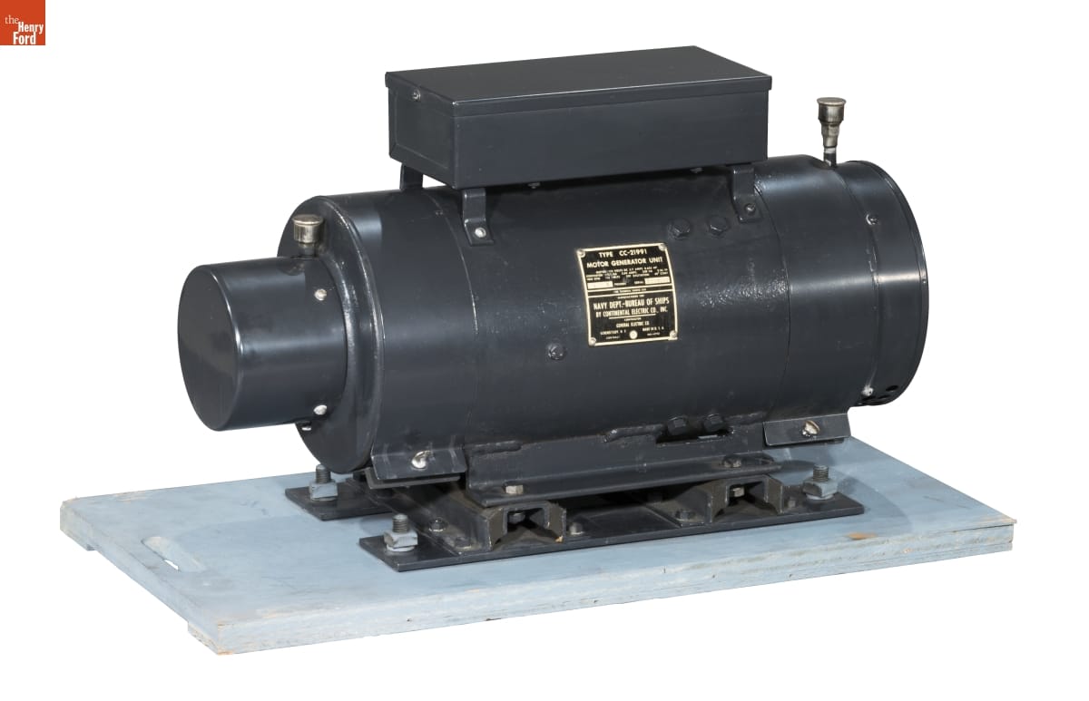 TYPE CC-21991 / MOTOR GENERATOR UNIT / MOTOR: 115 VOLTS DC 5.7 AMPS 0.625 HO / GENERATOR: 113/1/60 3.04 AMPS. 350 VA 0.85 PF / 1800 RPM 115 VOLTS SEP. EXCITATION 40[degree symbol] CONT / 8 POUNDS SERIAL B295178 / FOR GENERAL RADIO USE / MANUFACTURED FOR / NAVY DEPT. - BUREAU OF SHIPS / BY CONTINENTAL ELECTRIC CO., INC. / CONTRACTOR / GENERAL ELECTRIC CO. / SCHENECTADY, N.Y. MADE IN U.S.A. / CONTRACT NXs - 4753