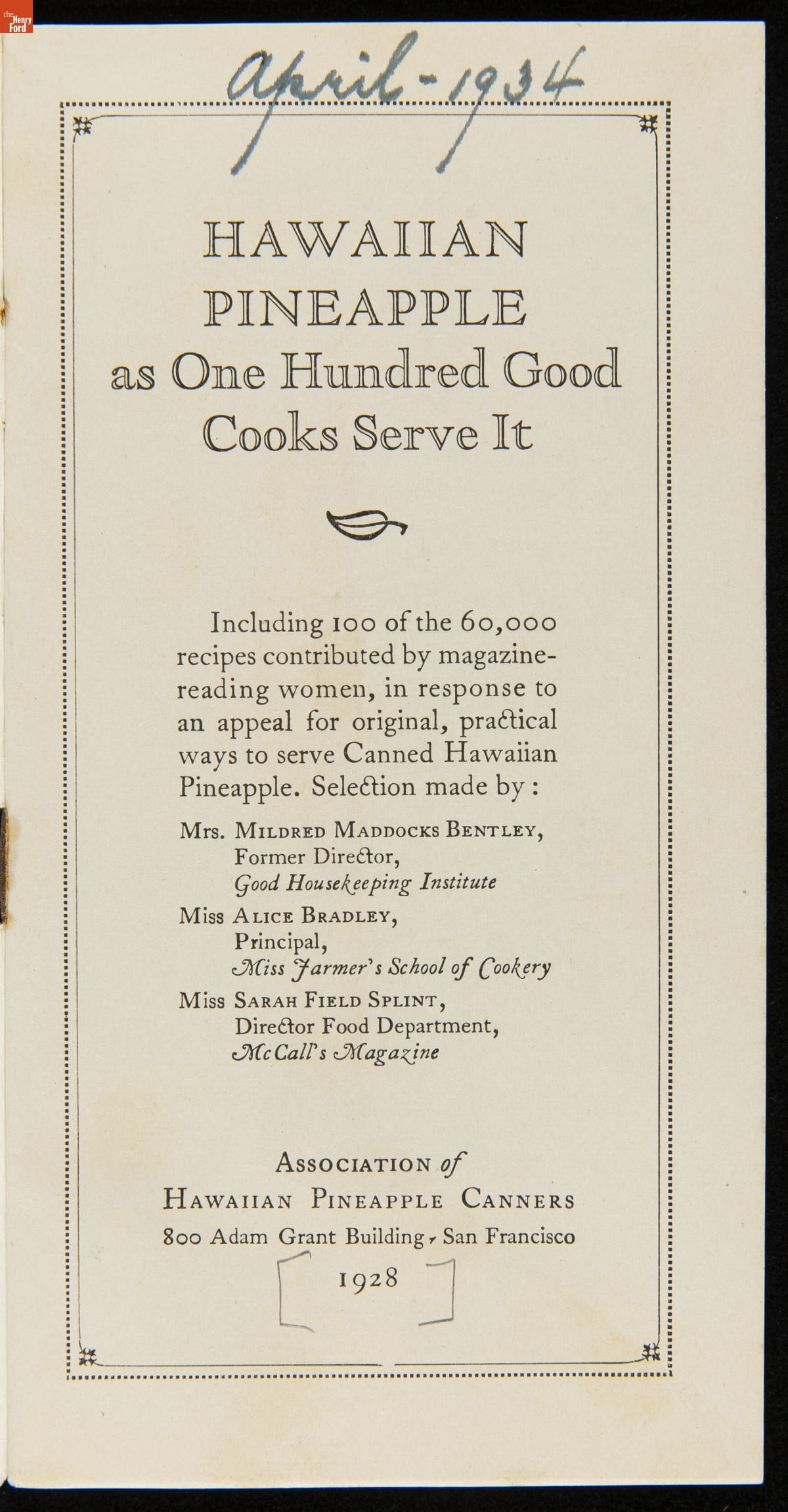 Recipe Booklet, "Hawaiian Pineapple, as 100 Good Cooks Serve It," 1928