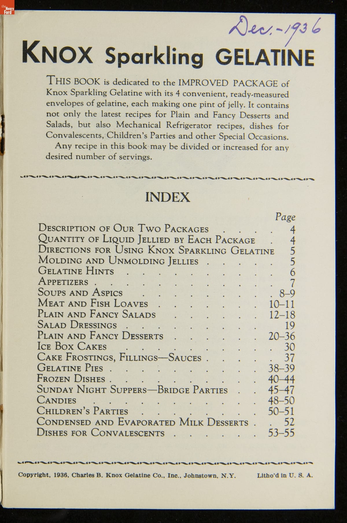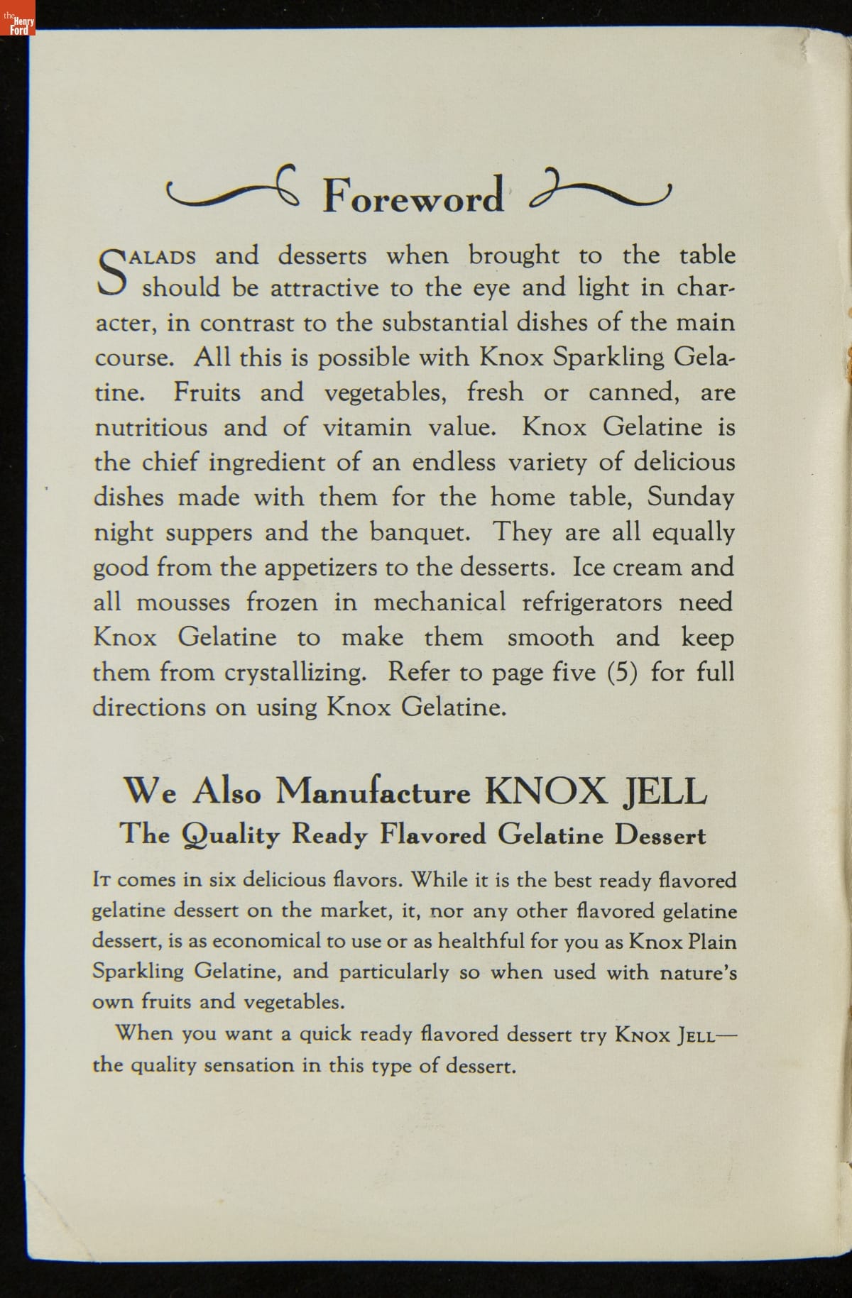 Recipe Booklet, "Knox Gelatine: Desserts, Salads, Candies and Frozen Dishes," 1936