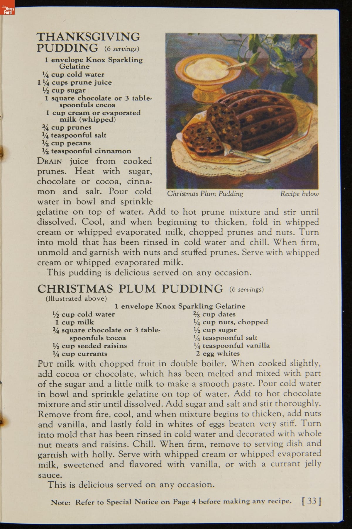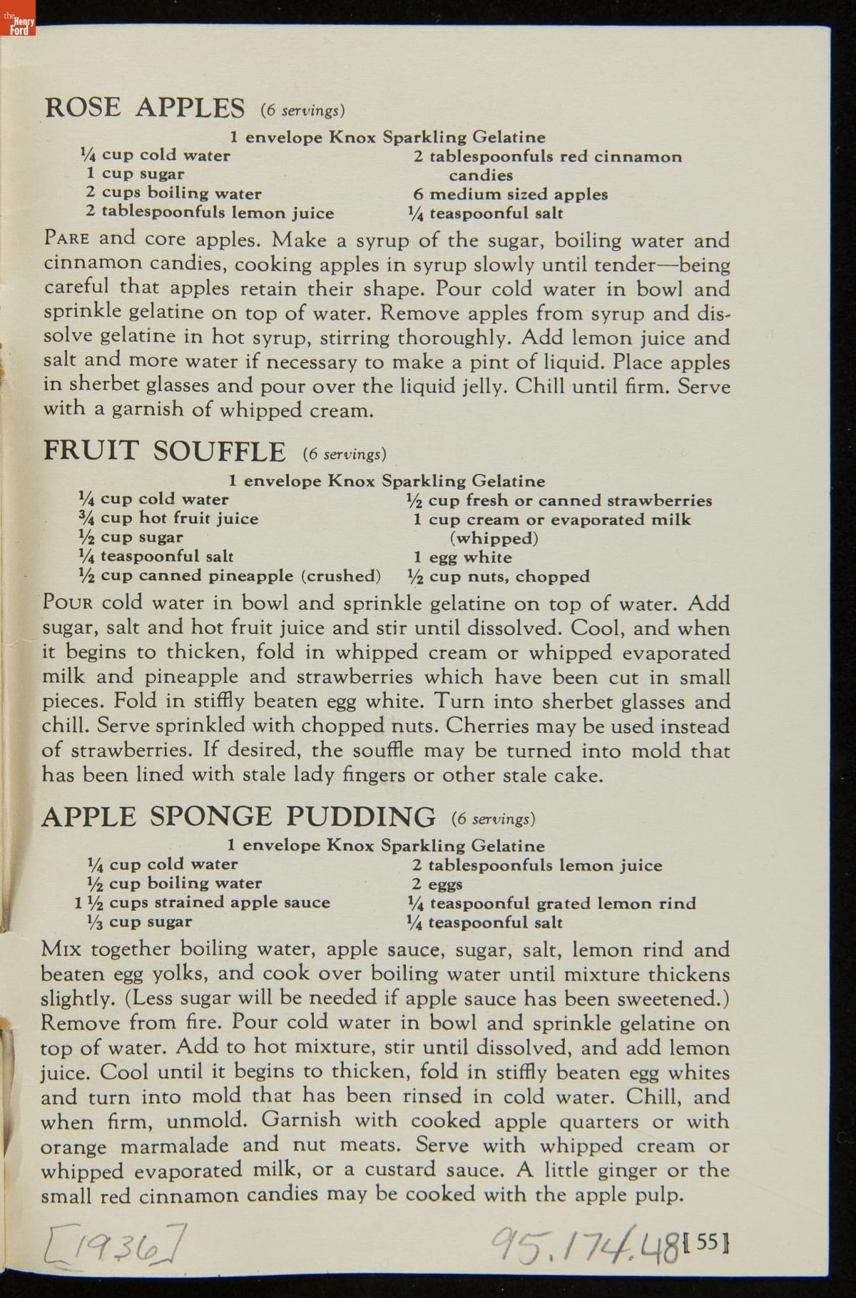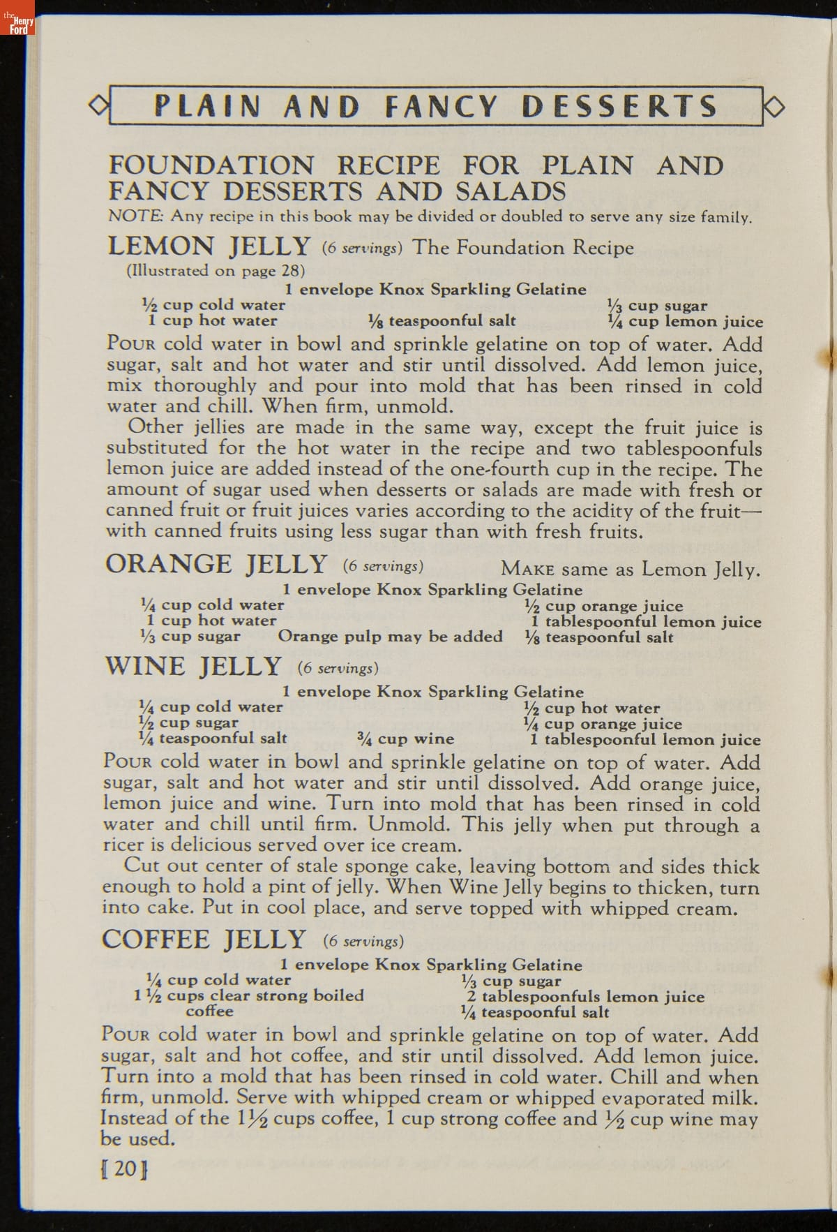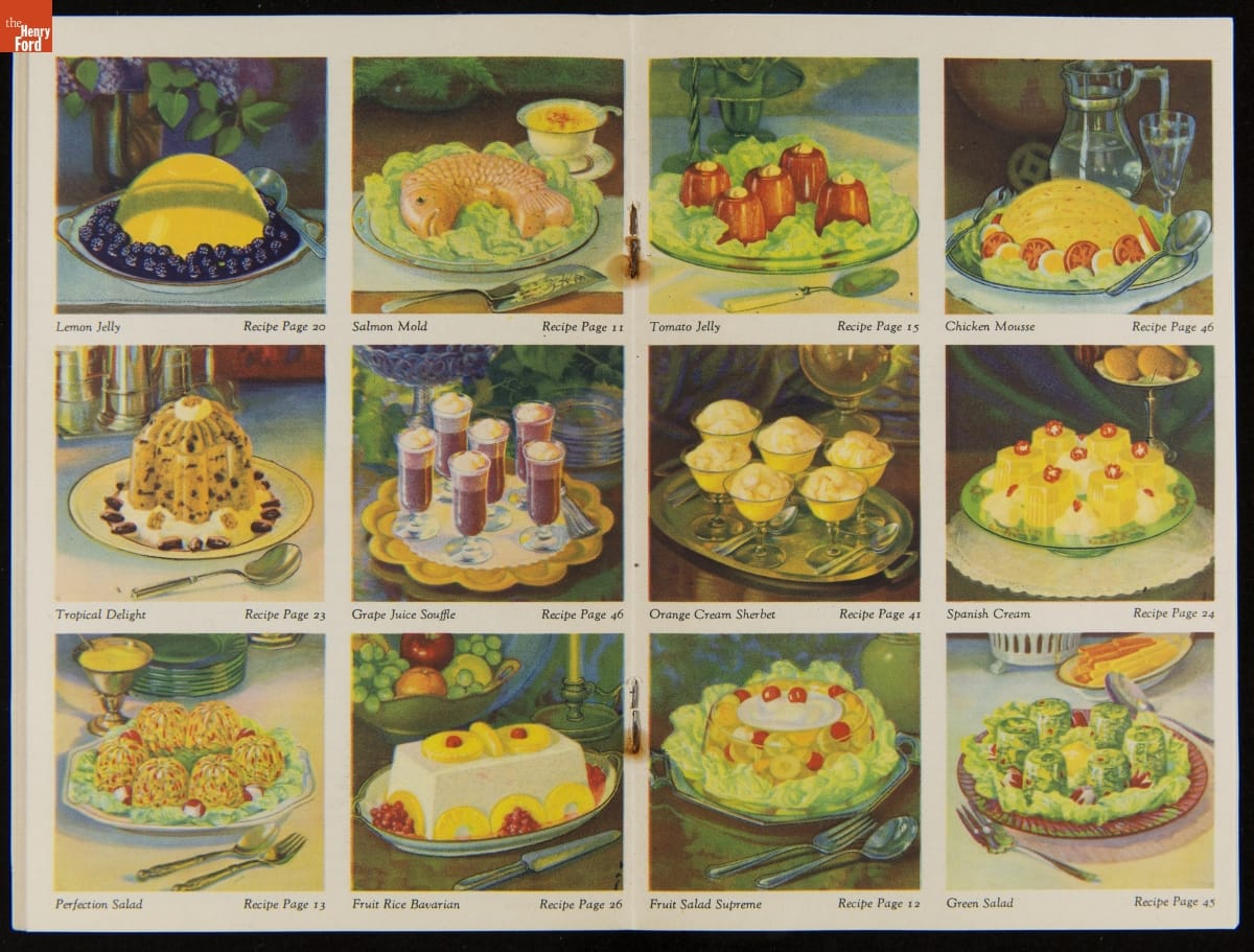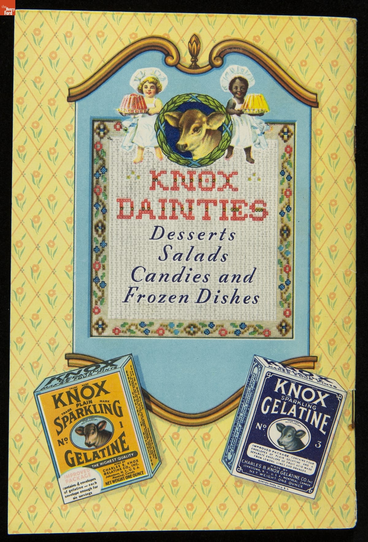 Charles B. Knox revolutionized the use of gelatin in 1889 when he developed a method for granulating gelatin (before this, gelatin was sold in sheet form). When Knox passed away in 1908, his wife Rose took over the Knox Gelatine company, marketing its gelatin to American housewives. Recipe booklets, like this one, provided creative uses for the ready-made product.