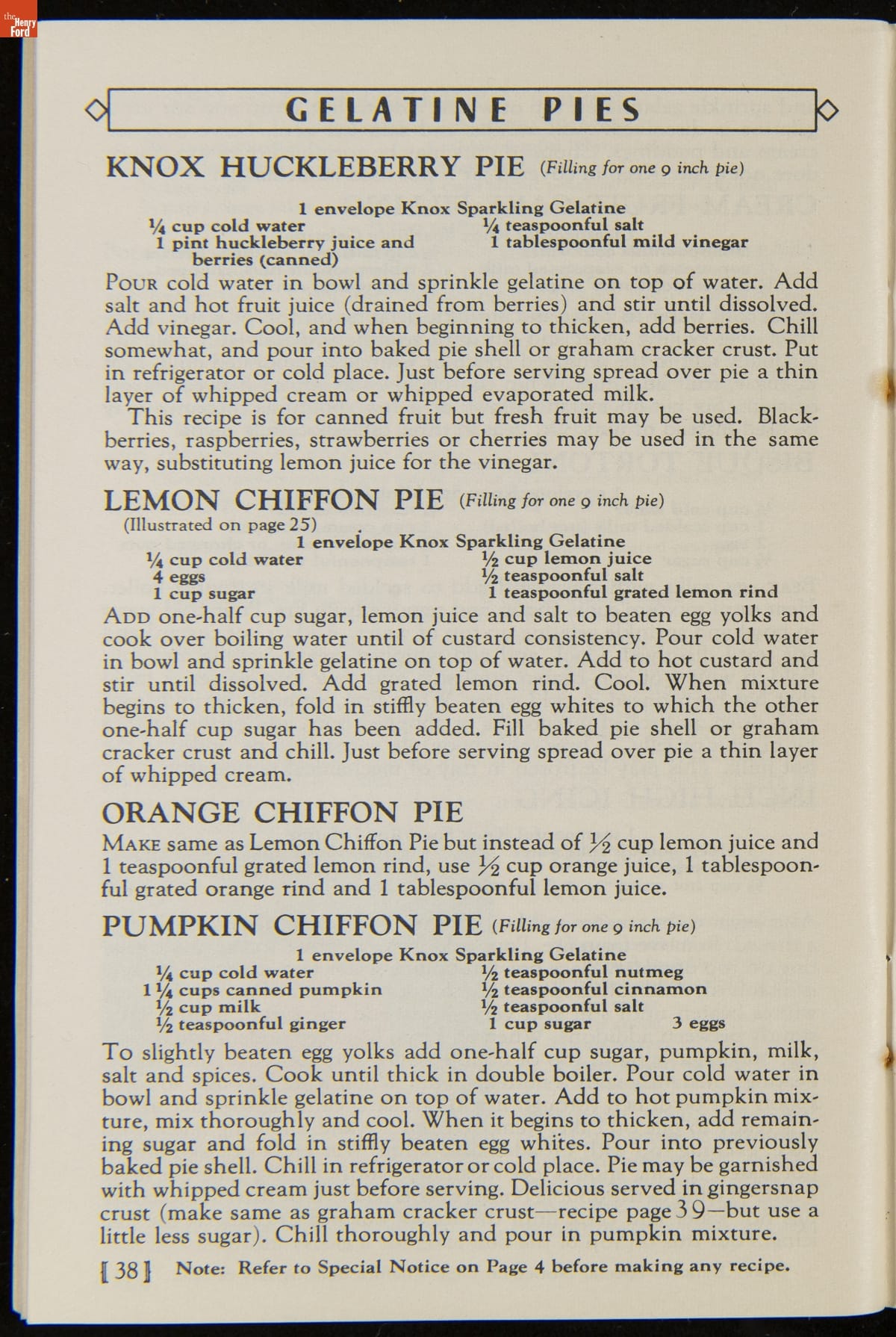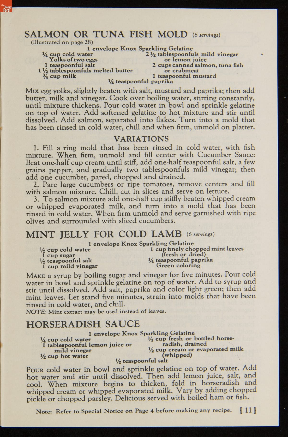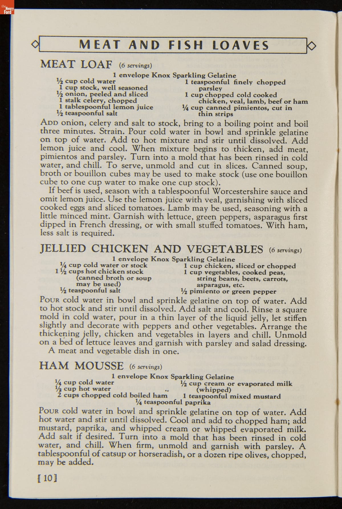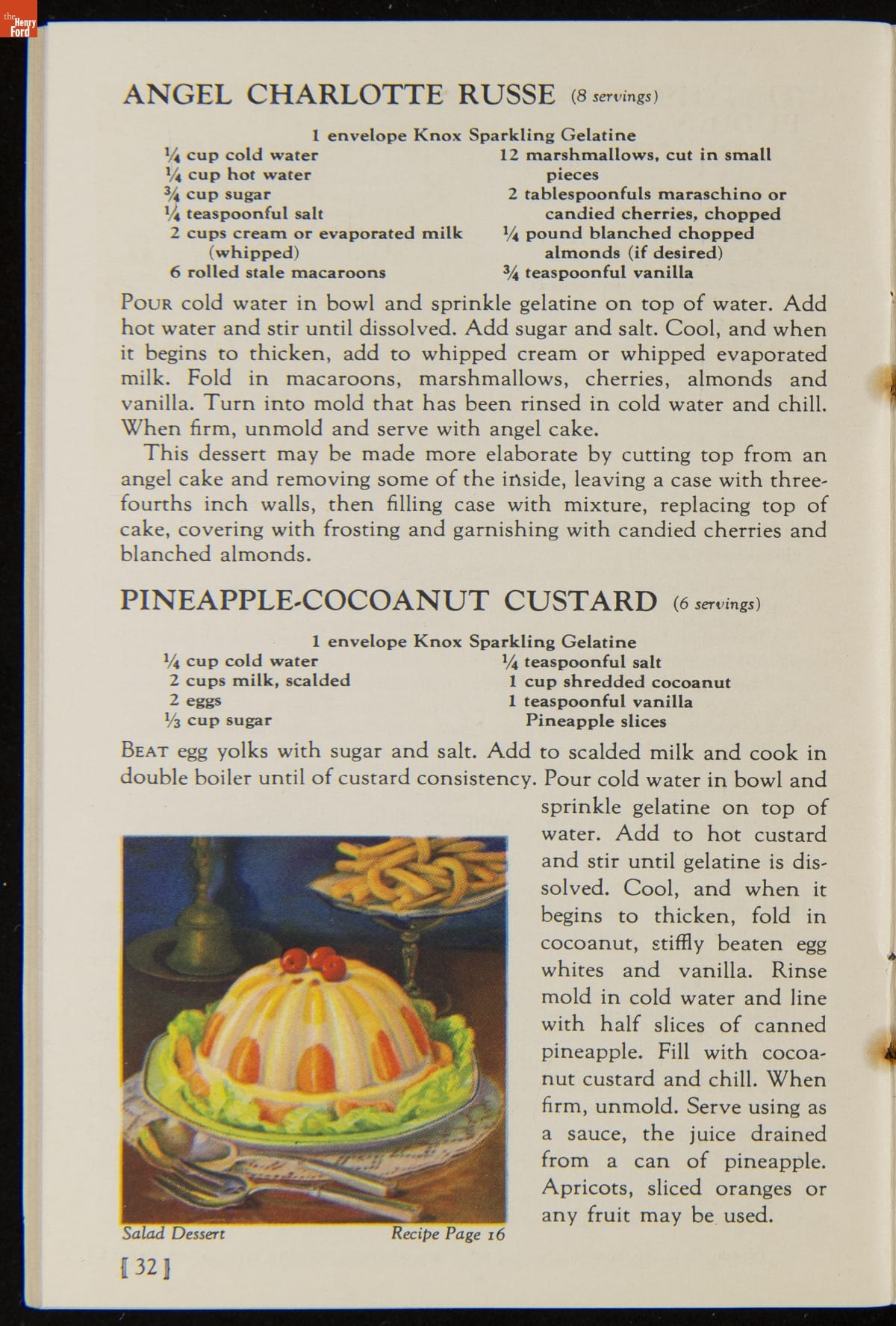 Charles B. Knox revolutionized the use of gelatin in 1889 when he developed a method for granulating gelatin (before this, gelatin was sold in sheet form). When Knox passed away in 1908, his wife Rose took over the Knox Gelatine company, marketing its gelatin to American housewives. Recipe booklets, like this one, provided creative uses for the ready-made product.