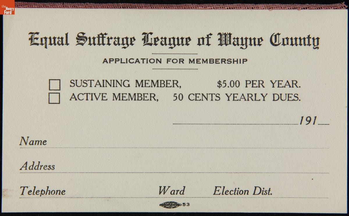 Application for Membership to the Equal Suffrage League of Wayne County, circa 1918