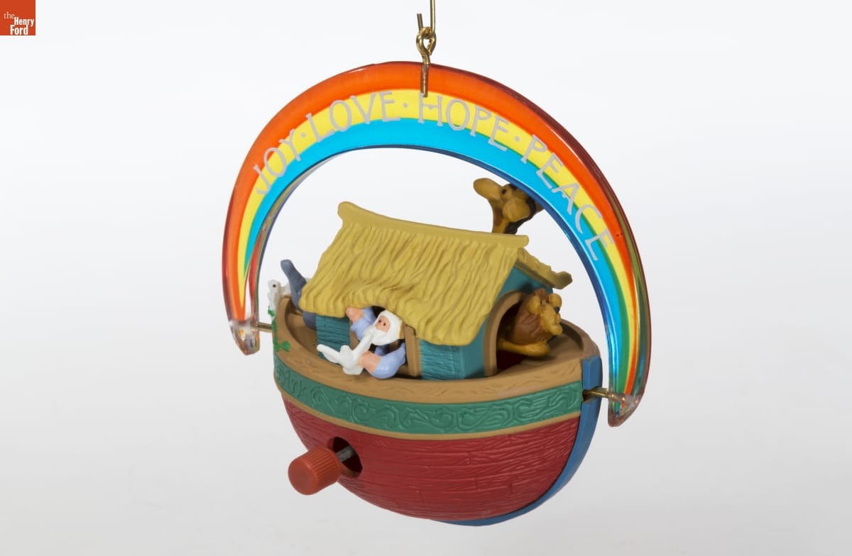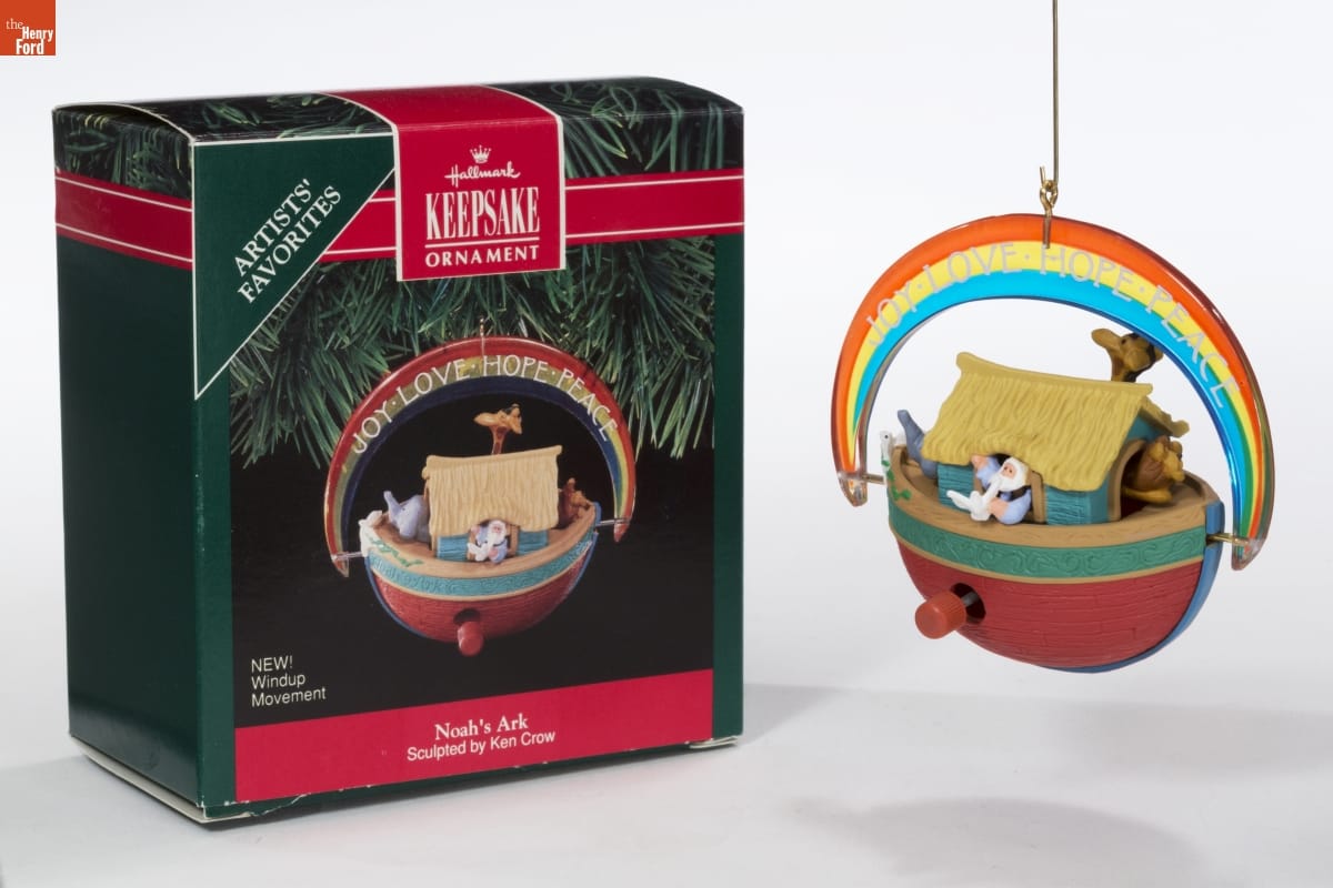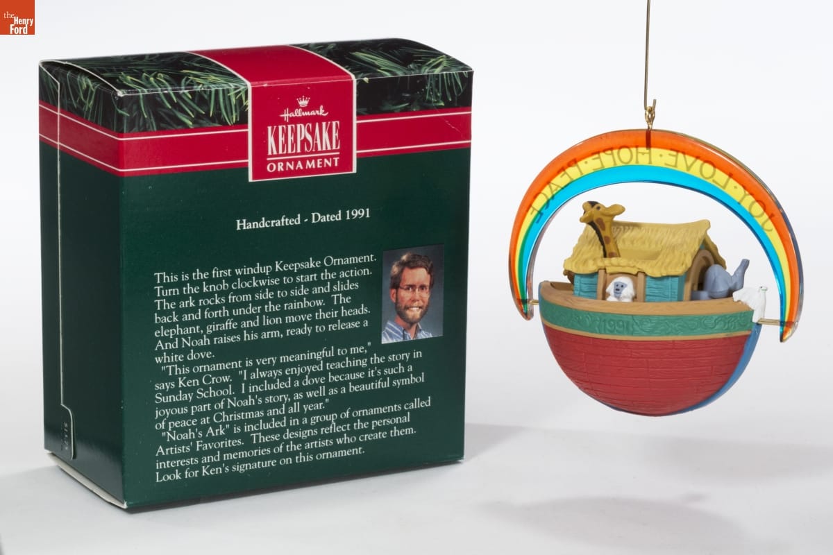 Hallmark / KEEPSAKE / ORNAMENT / Handcrafted - Dated 1991 / This is the first windup Keepsake Ornament. Turn the knob clockwise to start the action. The ark rocks from side to side and slides back and forth under the rainbow. The elephant, giraffe and lion move their heads. And Noah raises his arm, ready to release a white dove. / "This ornament is very meaningful to me," says Ken Crow. "I always enjoyed teaching the story in Sunday School. I included a dove because it's such a joyous part of Noah's story, as well as a beautiful symbol of peace at Christmas and all year." / "Noah's Ark" is included in a group of ornaments called Artists' Favorites. These designs reflect the personal interests and memories of the artists who create them. Look for Ken's signature on this ornament.
