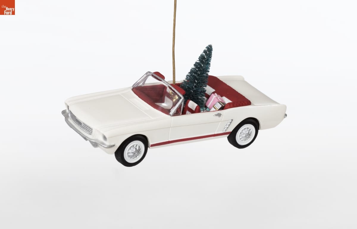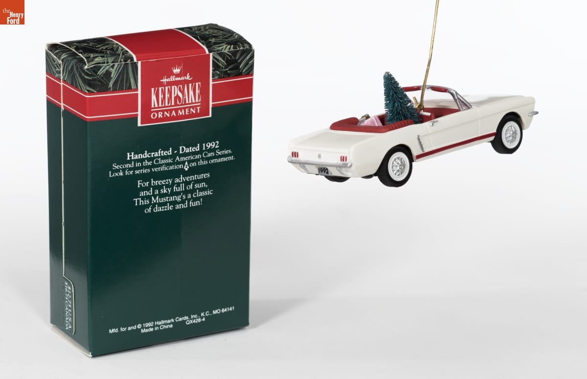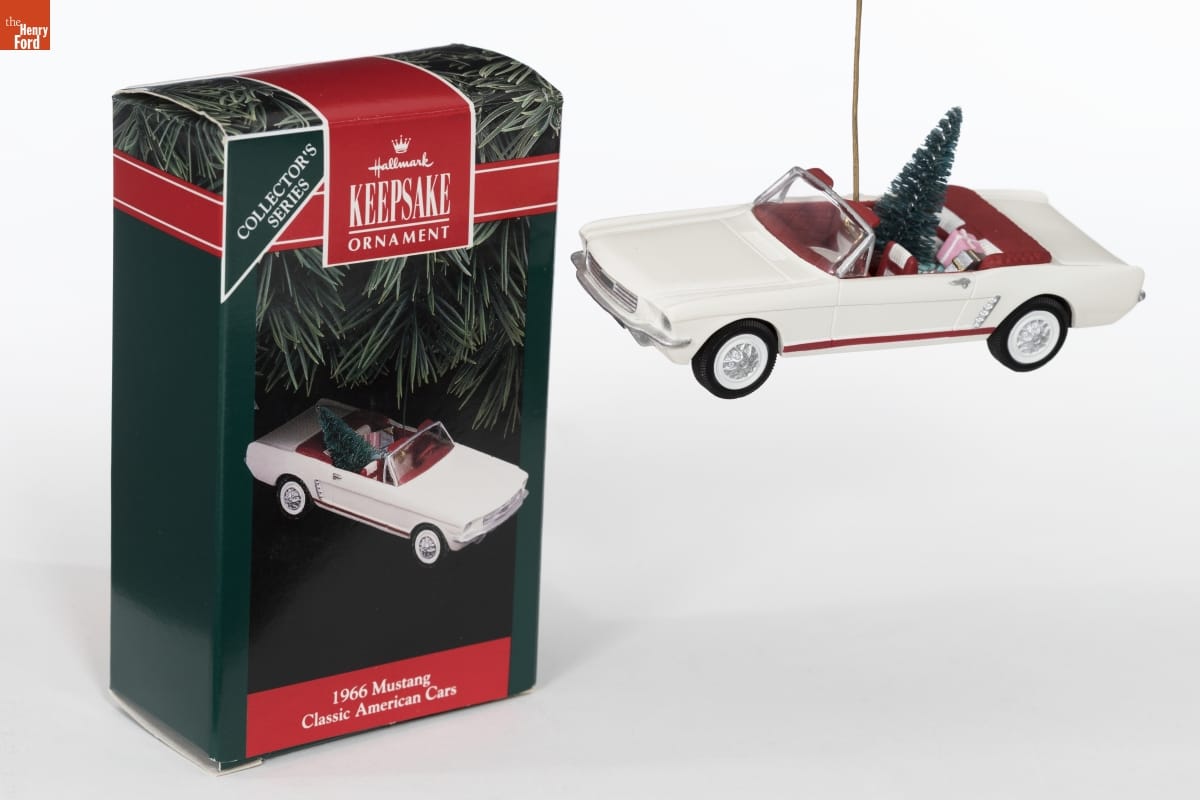 Already known for greeting cards, Hallmark introduced a line of Christmas ornaments in 1973. The company's annual release of an increasing array of ornaments appealed to customers' interest in marking memories and milestones as well as expressing one's personality and unique tastes. This 1966 Mustang ornament was the second in its "Classic American Cars" series. The first was a 1957 Corvette.