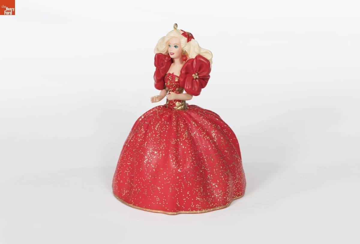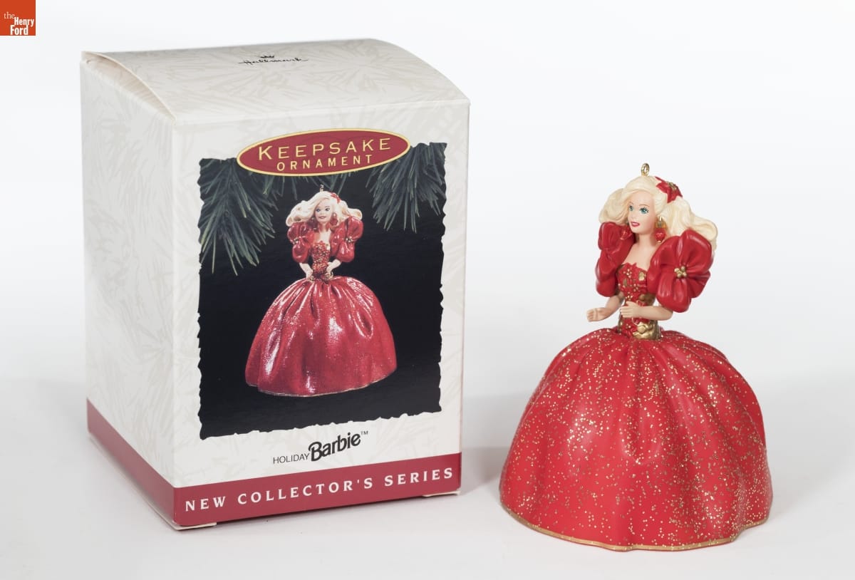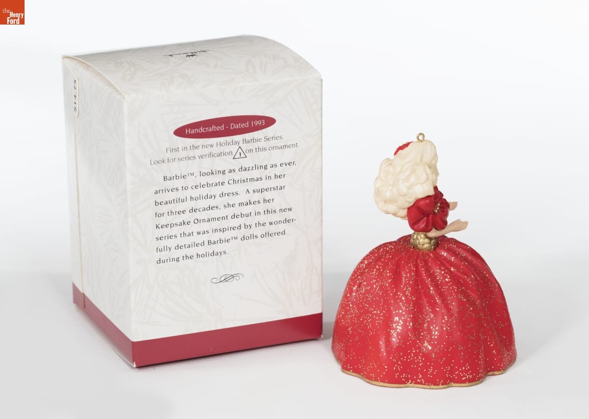 This was the first in a series of Holiday Barbie ornaments, which have proven extremely popular with enthusiasts and collectors. Artist Patricia Andrews, who created almost all the Barbie ornaments, began as an illustrator and gained a passion for sculpting. She landed her first job at Hallmark in the Engraving Studio because of her highly detailed work.