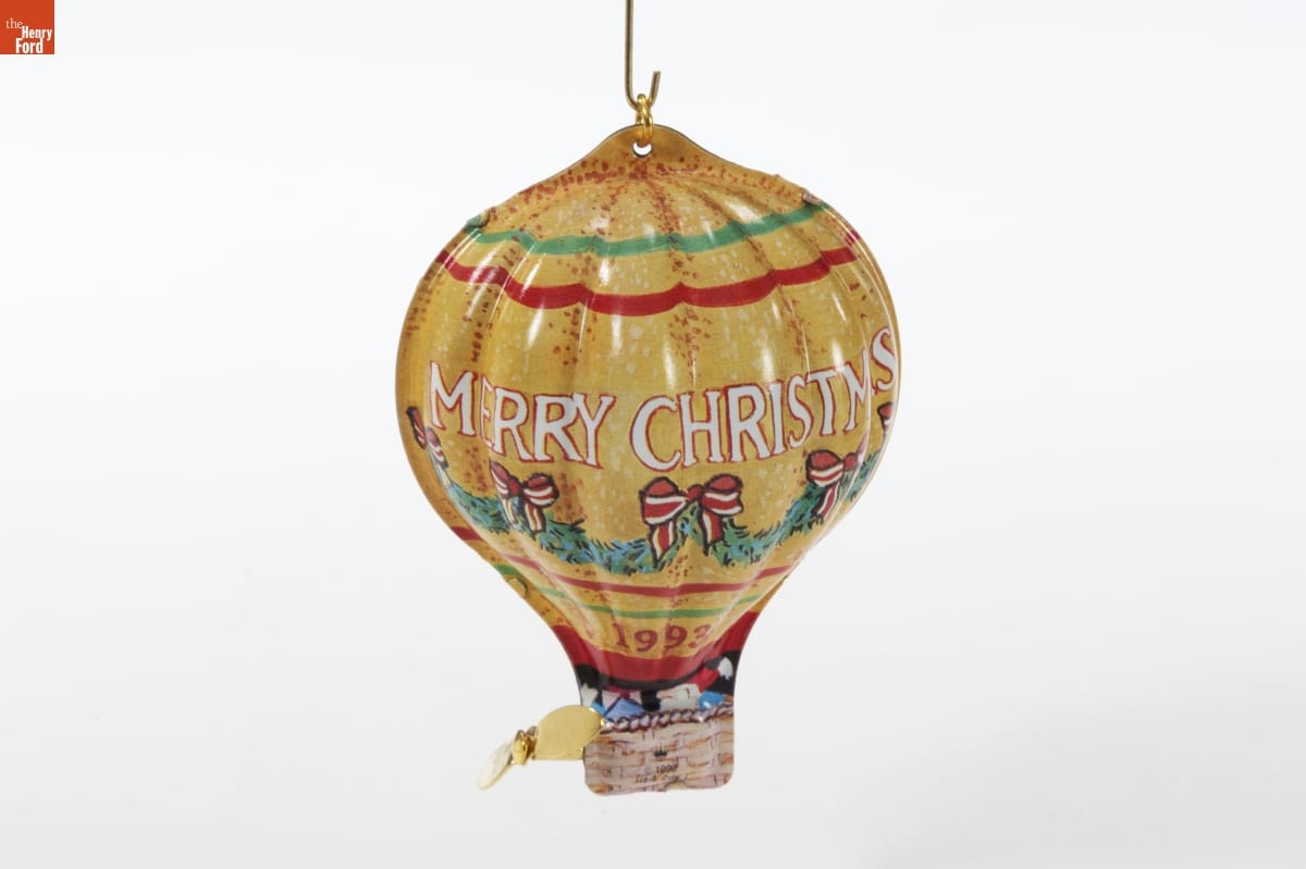 Pressed Tin - Dated 1993 / This colorful "Tin Hot Air Balloon" ornament is part of a group of three "Holiday Fliers" that includes a "Tin Blimp" and "Tin Airplane." Each of the festive aircraft has a revolving propeller to assure a safe landing on your tree.
