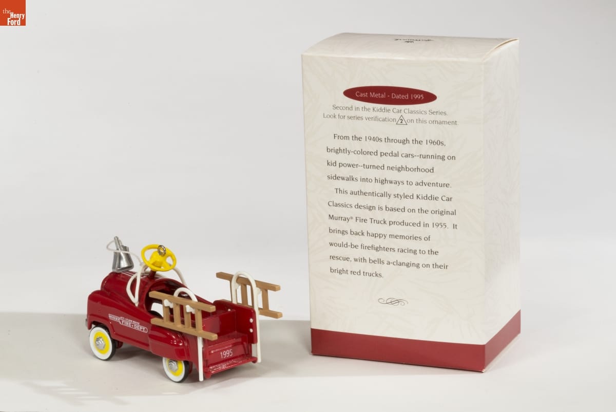 Cast Metal - Dated 1995 / Second in the Kiddie Car Classics Series. / Look for series verification 2 on this ornament. / From the 1940s through the 1960s, brightly-colored pedal cars--running on kid power--turned neighborhood sidewalks into highways to adventure. / This authentically styled Kiddie Car Classics design is based on the original Murray Fire Truck produced in 1955. It brings back happy memories of would-be firefighters racing to the rescue, with bells a-clanging on their bright red trucks.