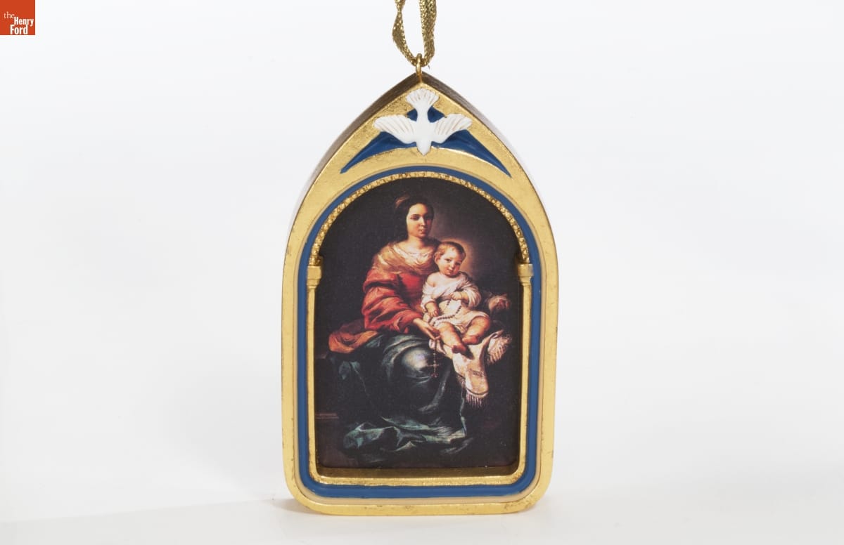 Beautifully framed in a finely worked pattern by Keepsake Ornament artist Linda Sickman, this lovely portrayal of the Madonna del Rosario dates to the 1640s. Reminiscent of the prevalent naturalisitc painting style of Sevillian painter Diego Velazquez, it depicts an affectionate embrace and reflects the love between mother and child. The original devotional image by the Spanish artist Bartolome Esteban Murillo is in the Galleria Palatina, Florence, Courtesy of Scala/Art Resource. / For decorative use only. Not for young children. / Handcrafted - Dated 1997